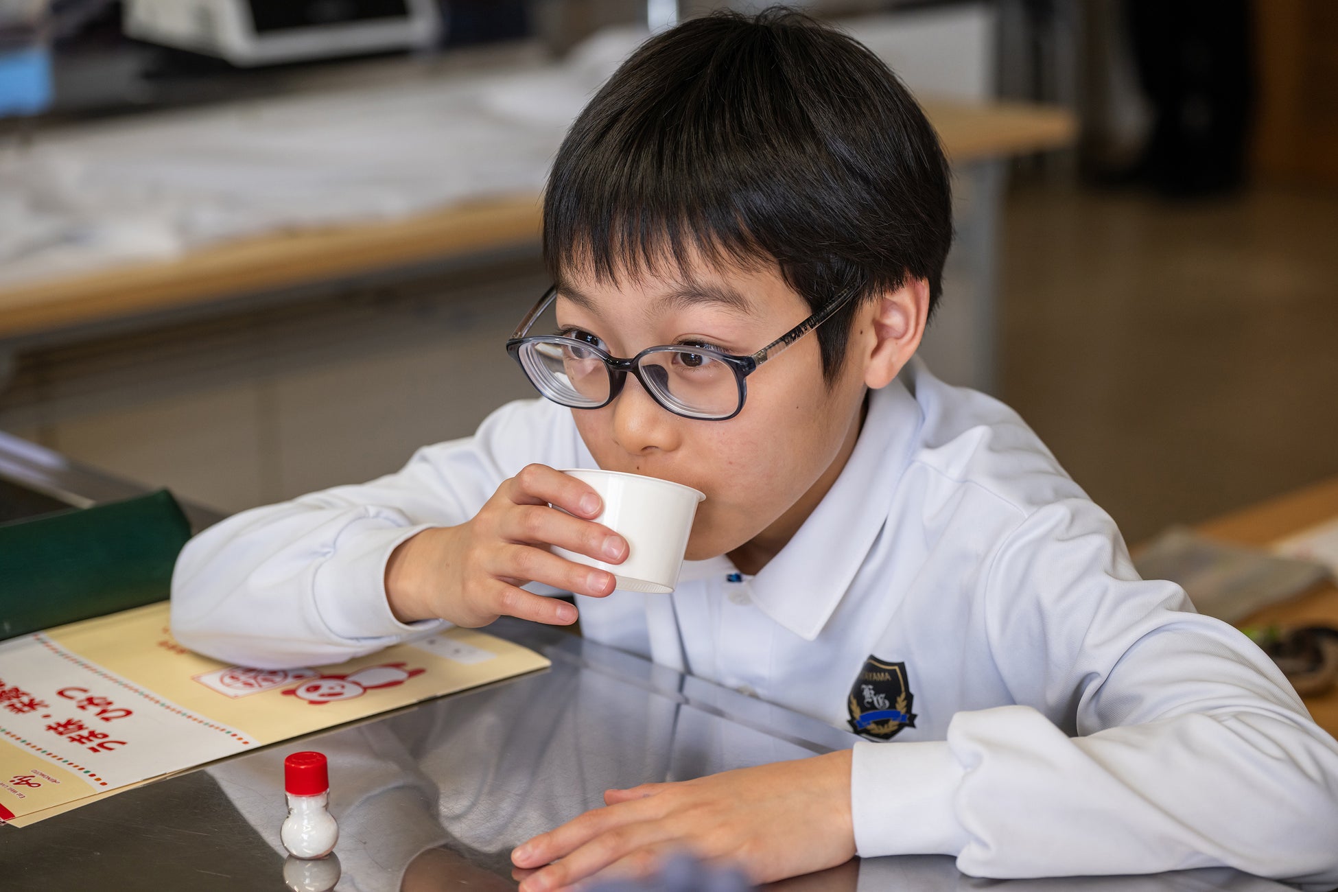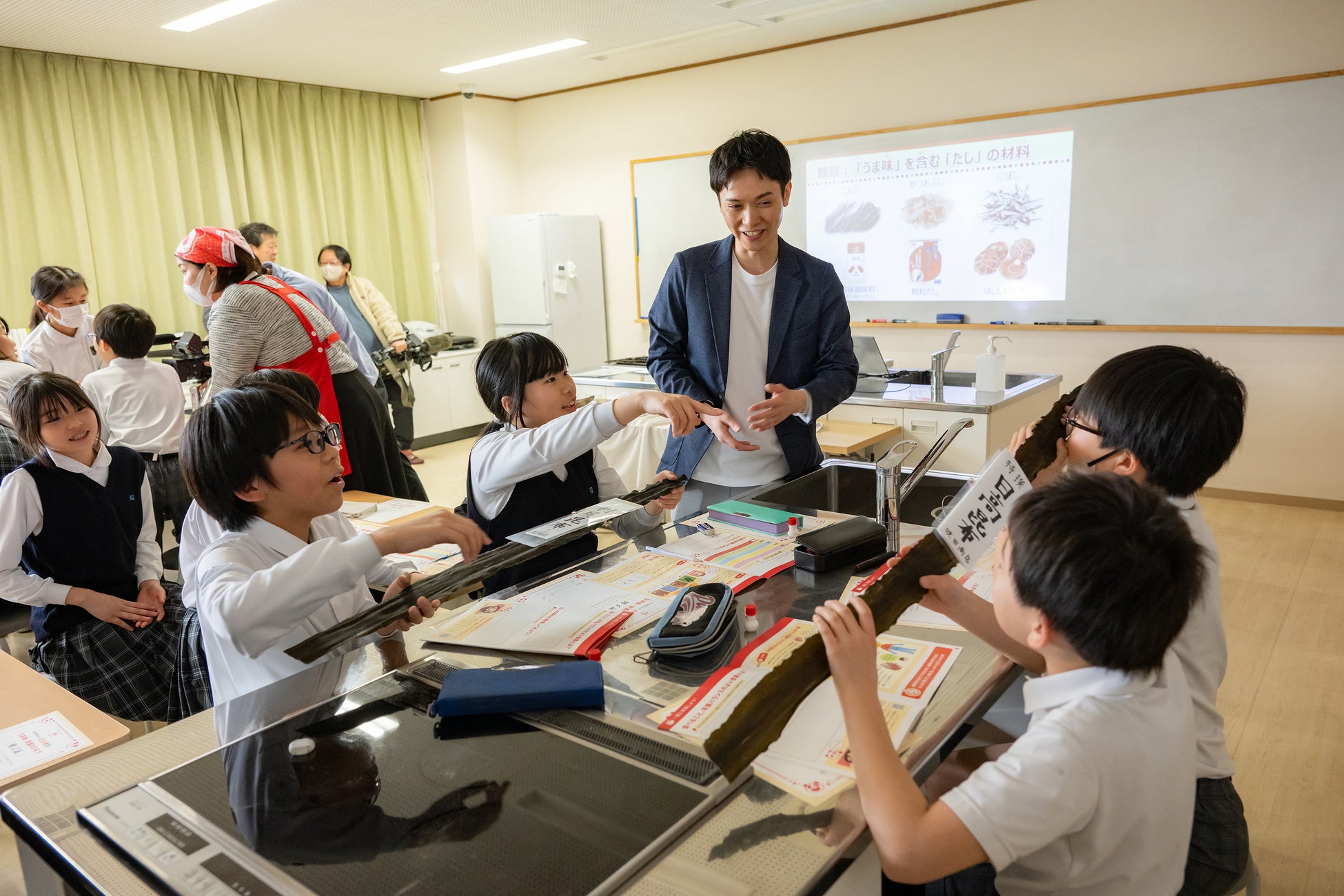 授業では、「あなたは、あなたが食べたものでできている」という言葉をキーワードに、食べものと体の関係について解説しました。続いて、おいしさを感じるための5つの基本味の1つであるうま味の役割について学びました。うま味はだしを味わうときに感じる味であり、昆布やかつお節にも含まれています。児童たちは小瓶入りのうま味調味料を使い、薄味の味噌汁にうま味を加える前後でどのように味が変化するかを体験しました。この体験を通して、うま味を上手に使えば塩分を増やさなくても料理のおいしさを引き出せることや、「umami」が世界共通語として使われていることを学びました。さらに、五大栄養素やバランスの良い食事の重要性、トップアスリートへの栄養サポート、だしの種類などについても紹介され、児童たちは健康な体づくりと栄養リテラシーへの理解を深めました。