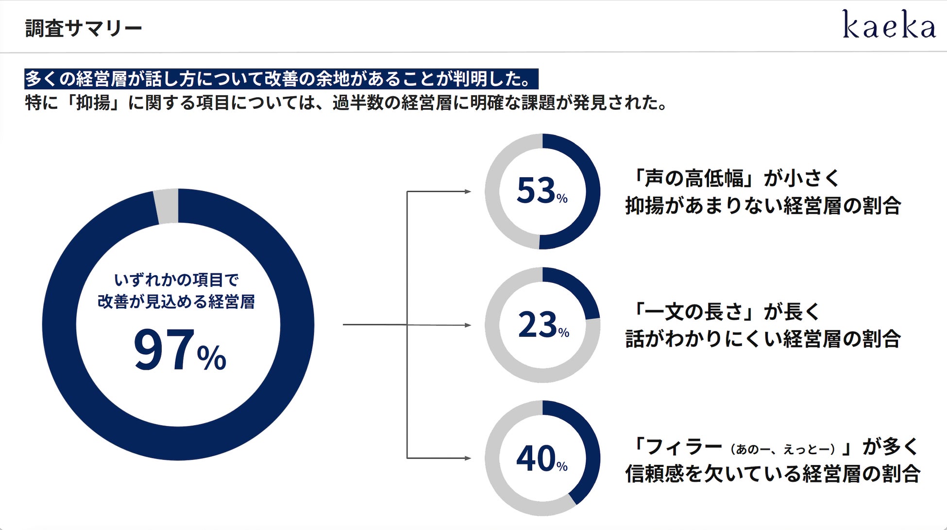 話し方トレーニングkaeka、経営層の話し方に関する分析を公開。日本の経営層の9割以上が話し方を磨く余地があることが判明。