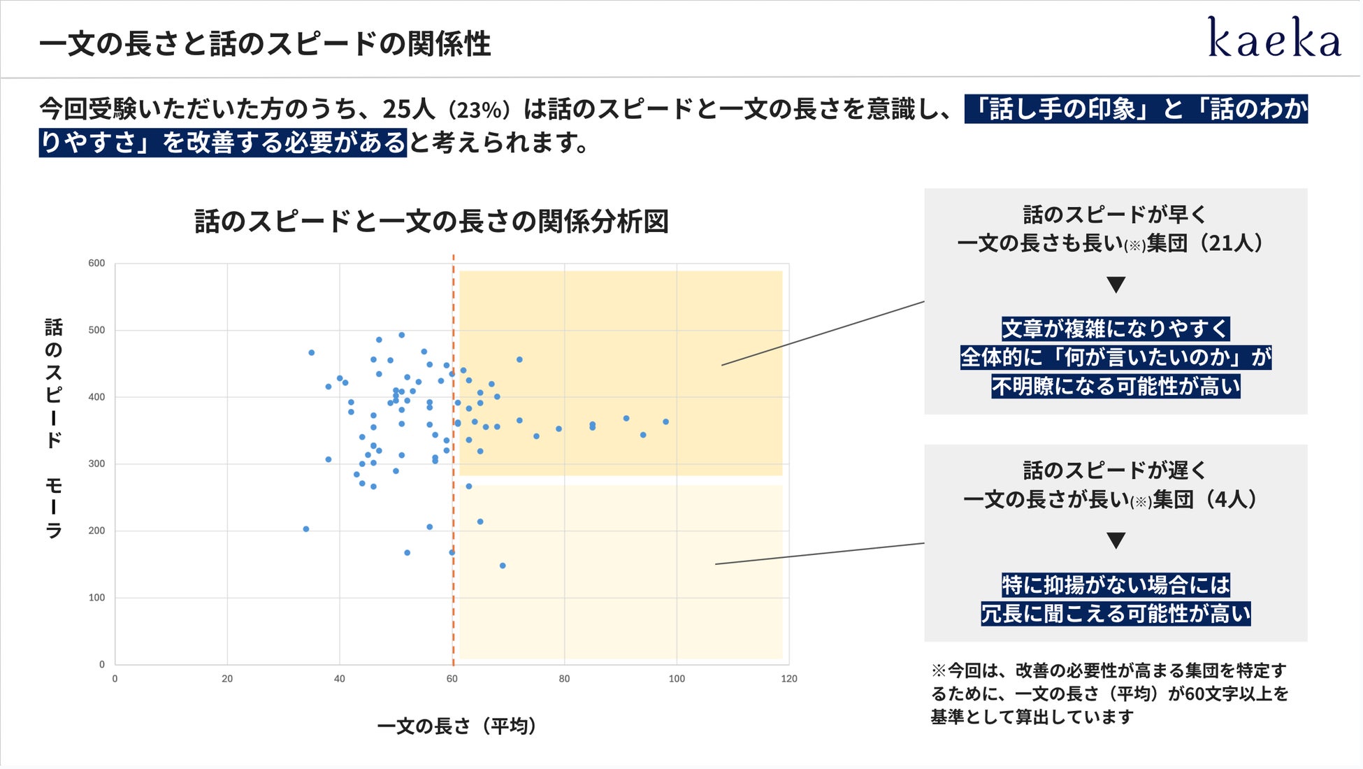 一文の長さと話すスピードは聞き手にとっての分かりやすさを左右します。具体的には、プレゼンでは一文の長さは一文あたり60文字程度、スピードについては290〜350モーラ/分のスピードが最適とされています。(カエカ独自の分析をもとに数値を算出しています。)