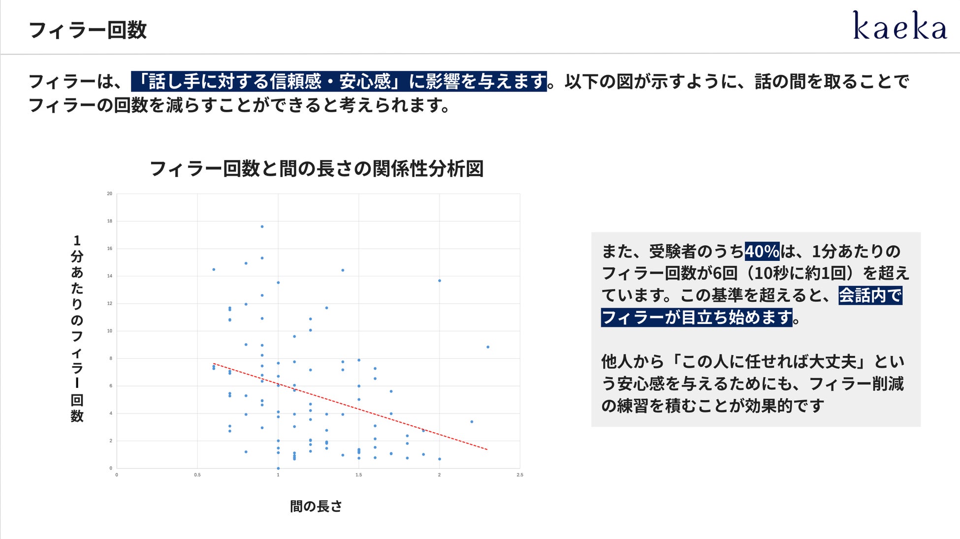 1分間に6回以上フィラーを使用していると、話の中でフィラーが目立つようになっています。(カエカ独自の分析をもとに数値を算出しています。)