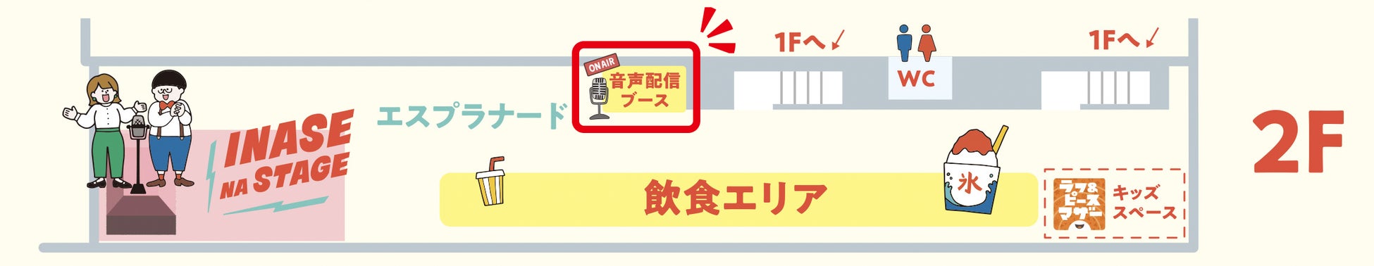 普段からstand.fmを配信しているブレイク寸前の若手芸人や人気芸人が、2階エスプラナードの音声配信ブースにて公開生配信を実施します。