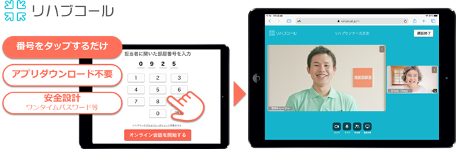 「リハブコール」は、介護事業者や高齢者ができるだけ少ないステップでオンライン会話ができるようにオリジナルで開発しているオンライン会話ツールです。