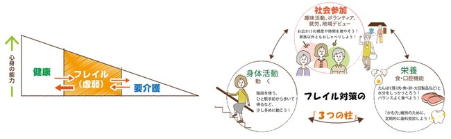 フレイルであることに早めに気付き、フレイル対策の3つの柱である社会参加、身体活動、栄養(食・口腔)に取り組めば、元の状態に戻ることもできます。