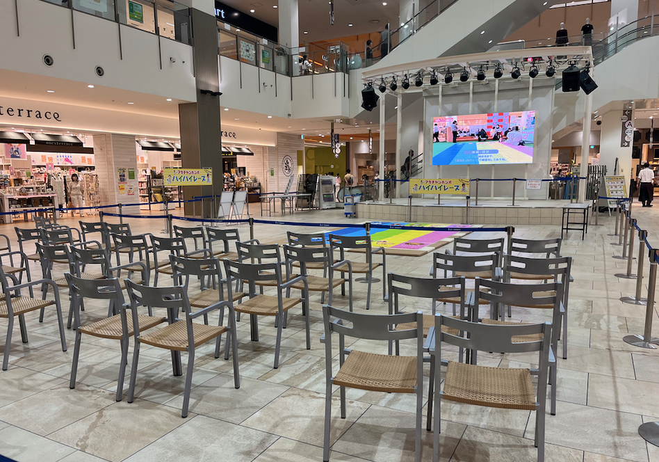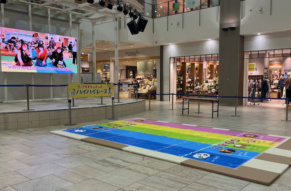 アカチャンホンポ主催のハイハイレース(赤ちゃんがハイハイでゴールを目指すレース)の隣ブースで