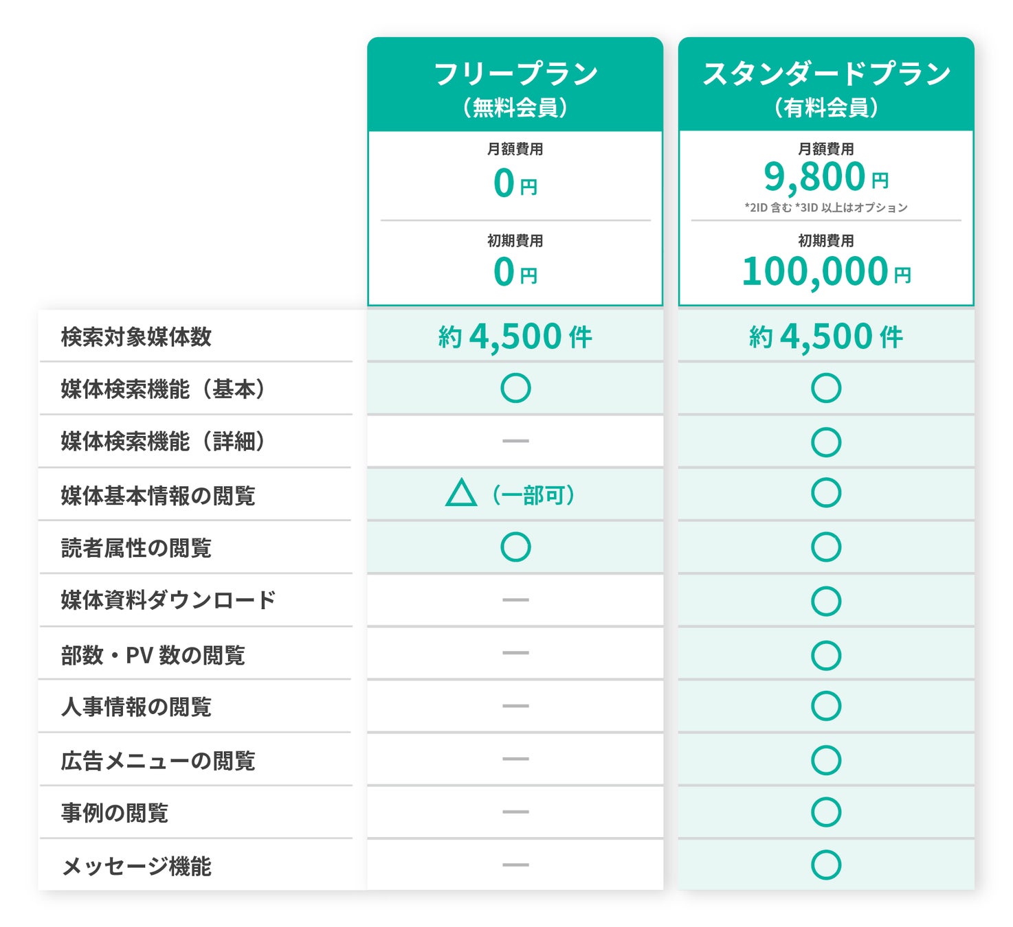 メディアデータオンラインでは、フリープラン(無料会員)とスタンダードプラン(有料会員)の2つのプランを提供しています。https://www.media-data.jp