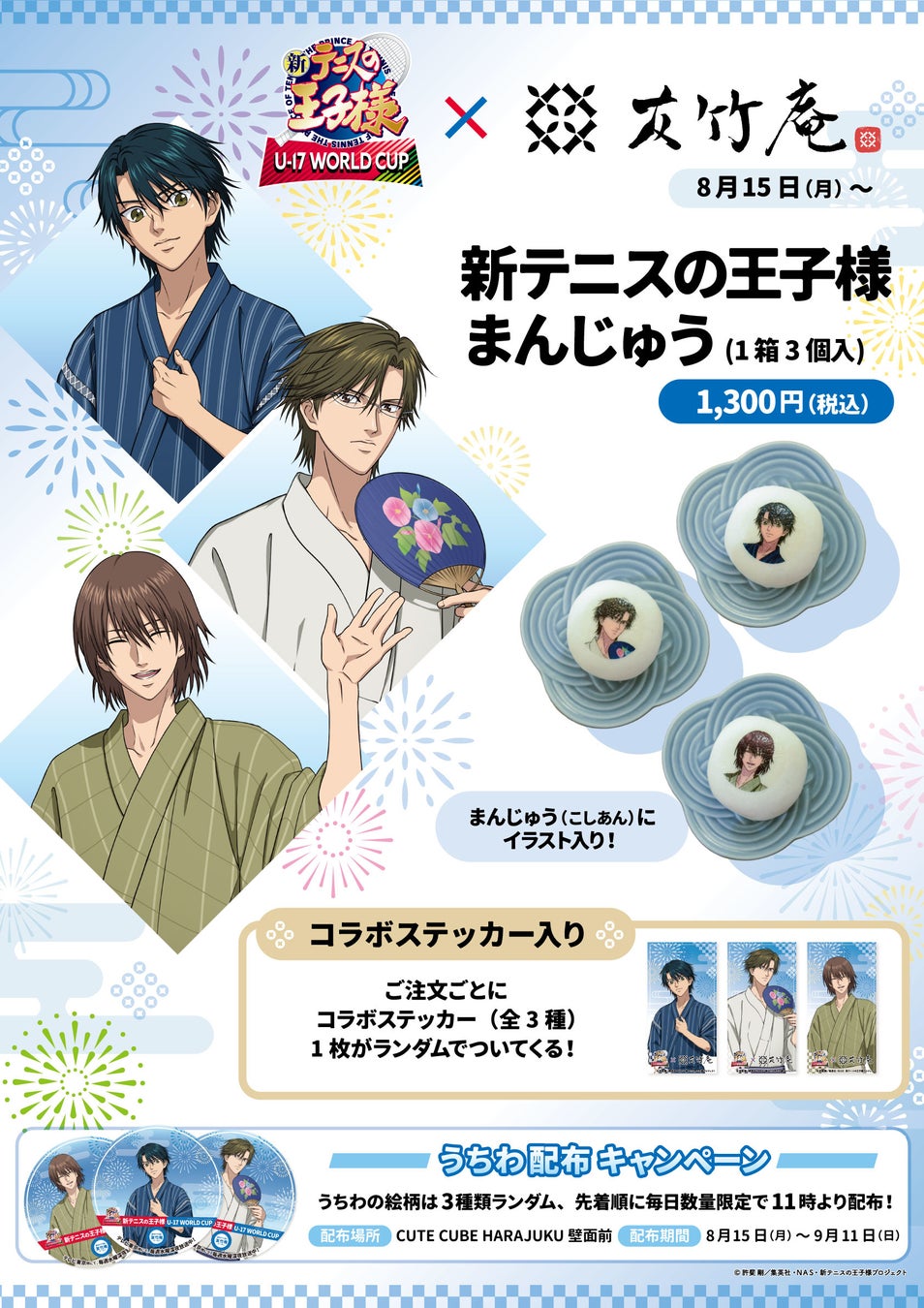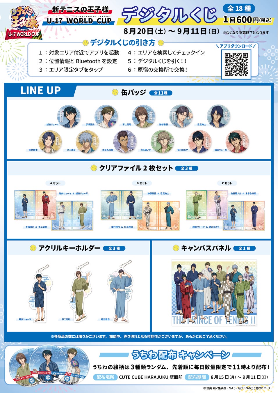 AppBank株式会社(本社:東京都新宿区、代表取締役社長CEO:村井 智建、証券コード:6177、以下 AppBank)は、8月20日より、スマートフォン向けアプリ「HARAJUKU」内において、すべて描きおろしイラストを利用した、『新テニスの王子様 U-17 WORLD CUP』デジタルくじ の販売を開始することをお知らせいたします。デジタルくじでは、缶バッジやアクリルキーホルダー、クリアファイルなどが当たり、商品は原宿竹下通り沿いにある店舗「原宿friend」と「原宿竹下通り友竹庵」にて交換が可能です。また、これを記念して、アニメ『新テニスの王子様 U-17 WORLD CUP』が原宿竹下通りにてフラッグ、横断幕、「CUTE CUBE HARAJUKU」の壁面をジャックすることと、「原宿竹下通り友竹庵」において、「新テニスの王子様まんじゅう」を販売することをあわせてお知らせいたします。あわせて、「CUTE CUBE HARAJUKU」壁面前で毎日11時より先着でうちわの配布キャンペーンも行います。