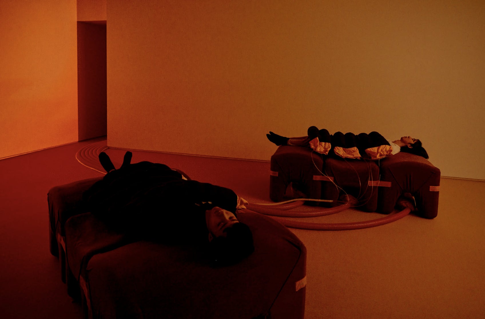 やわらかいロボットに包まれ、触覚から「無」になるのが「無中」の時間です。視覚・聴覚・嗅覚の演出を組み合わせて体感をより拡張します。