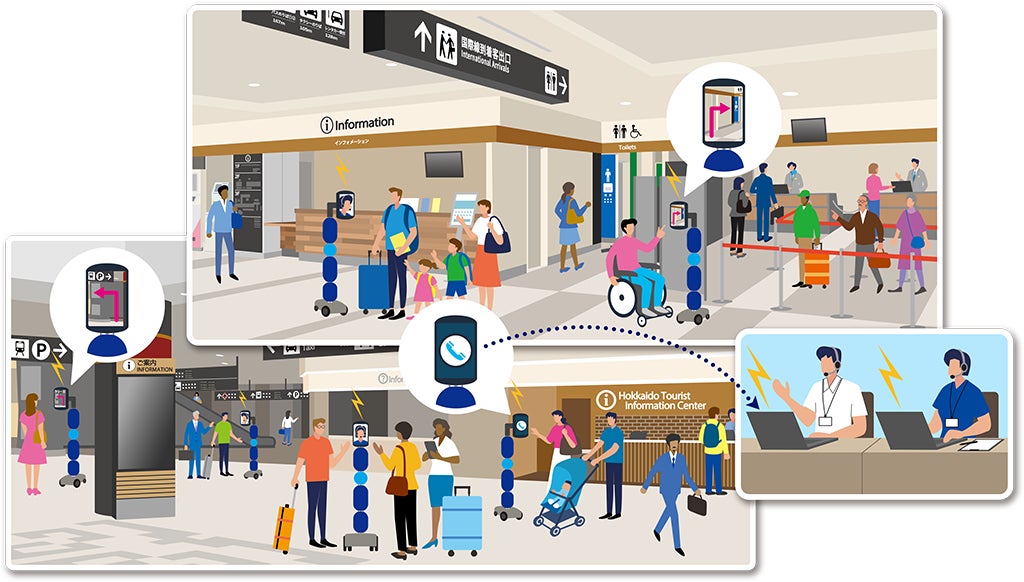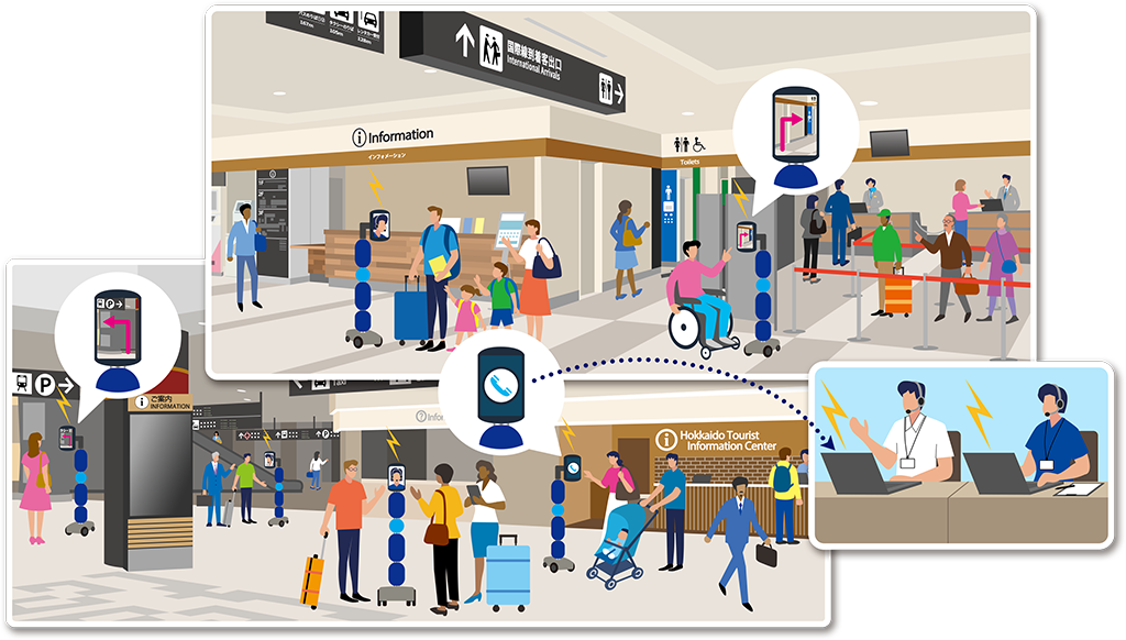 実施内容: 空港内の混雑状況に合わせて、動画再生機能や問い合わせボタン機能、プロアクティブ案内などを組み合わせて案内業務を実施し、混雑解消や利用者の行動データ収集と分析、運用検証を行う。