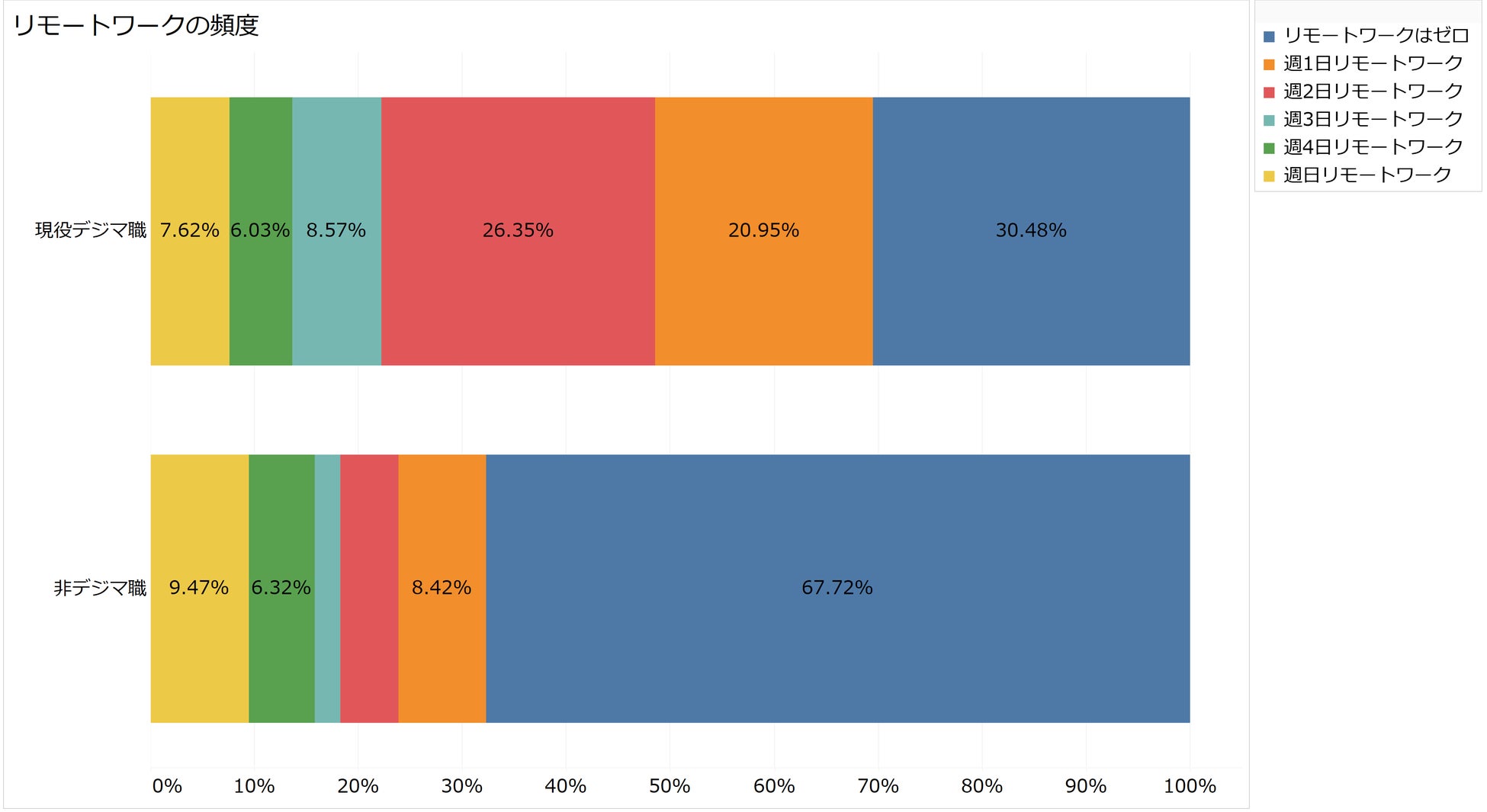 ⇨ フルリモート(週5日リモート)は非デジタルマーケティング職が2%ほど高く浸透している模様ですが、週1、2日のリモート率はデジタルマーケティング職の方が高く、47%と約半数がリモート就業をしています。