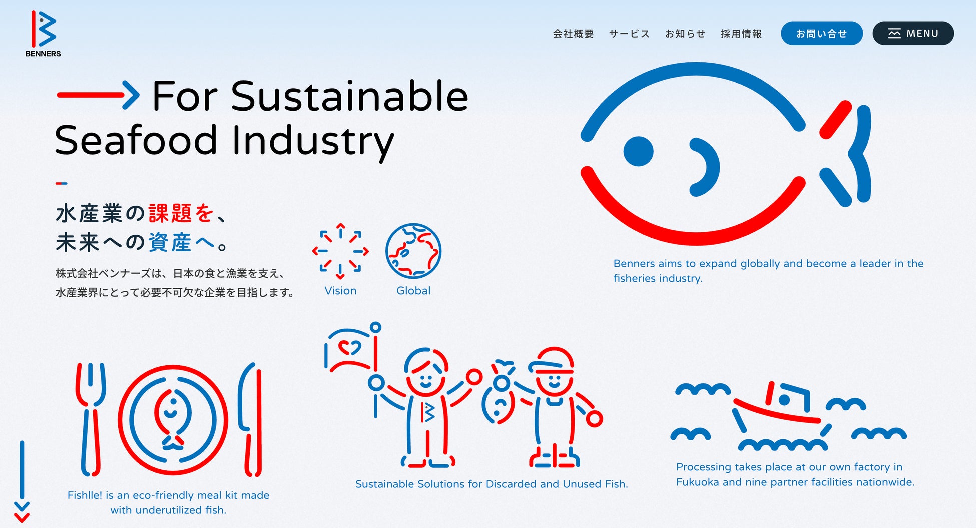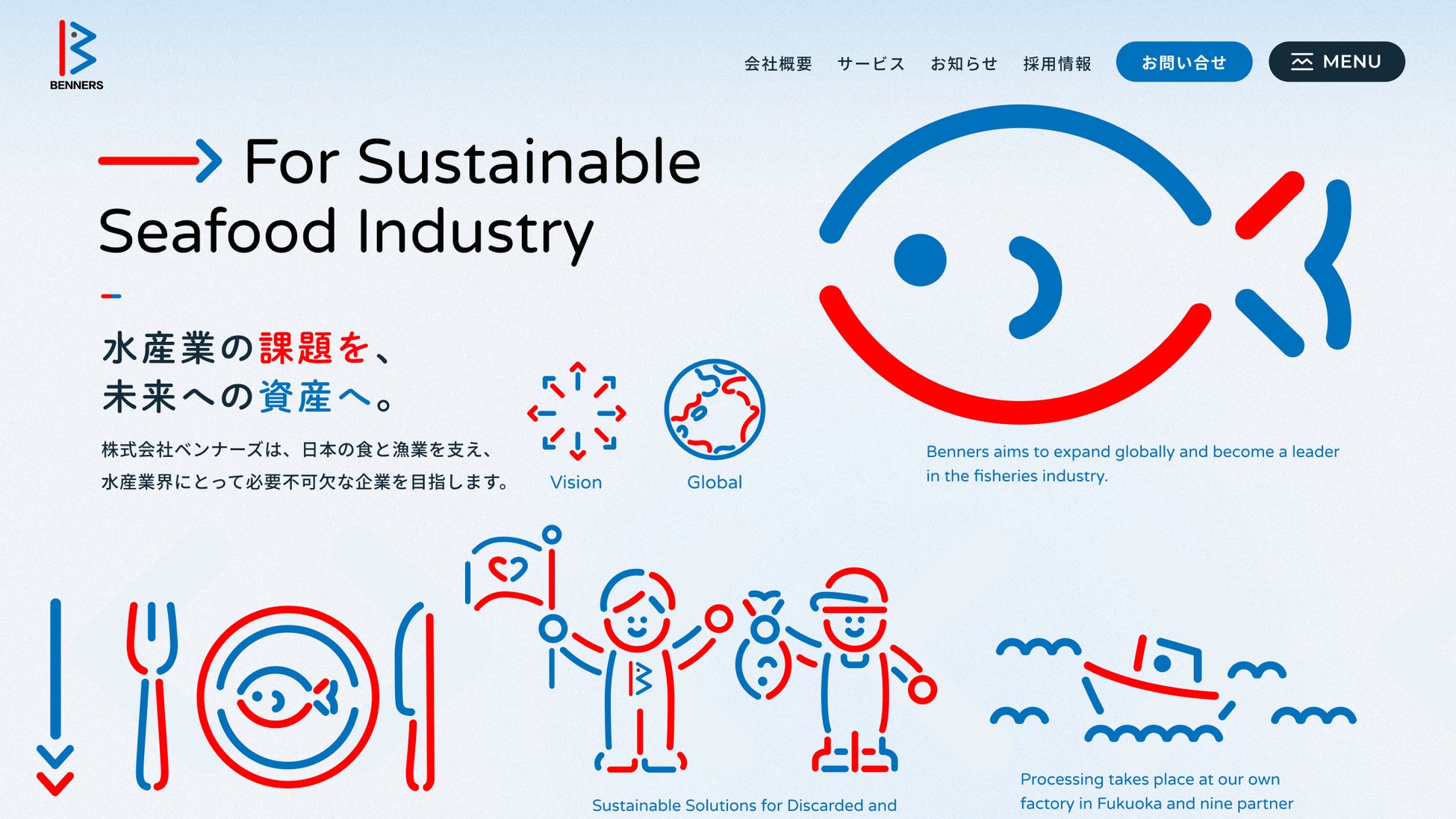 株式会社ベンナーズ(本社:福岡県福岡市、代表取締役社長:井口剛志、以下「ベンナーズ」)は、2025年4月25日(金)にコーポレートサイト(https://www.benners.co.jp/)を全面リニューアルいたしました。本リニューアルは7周年を迎えた節目に合わせ、ビジョン「サステナブルな水産インフラを構築し、世界の水産業界にとって最も必要とされる会社へ」を表現し、未来の投資家・未来の社員・メディアとの対話を強化することを目的としています。本プロジェクトはデザイン会社 株式会社NASU(本社:大阪市中央区、代表取締役:前田高志)によるクリエイティブ支援のもと実施しました。