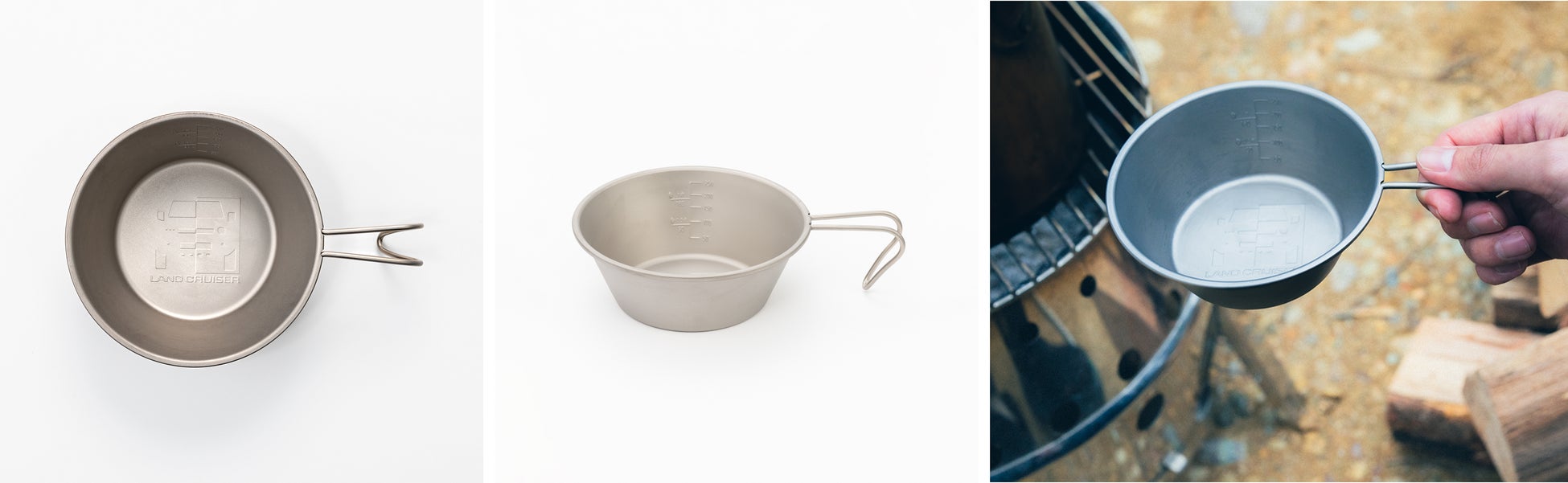 日本の金属製品の産地として知られる新潟県燕三条の職人の手によるチタンシェラカップ。頑丈でかつ軽量で高い機能性を持ったアイテム。底にはランドクルーザー“250”をモチーフにしたオリジナルデザインを刻印。