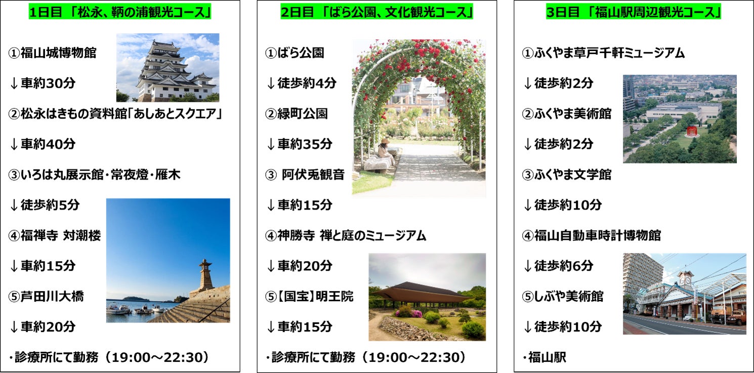 本取り組みは、協力医師に、福山市内の夜間小児診療所での勤務および近隣観光と併せ数日間お過ごしいただきます。