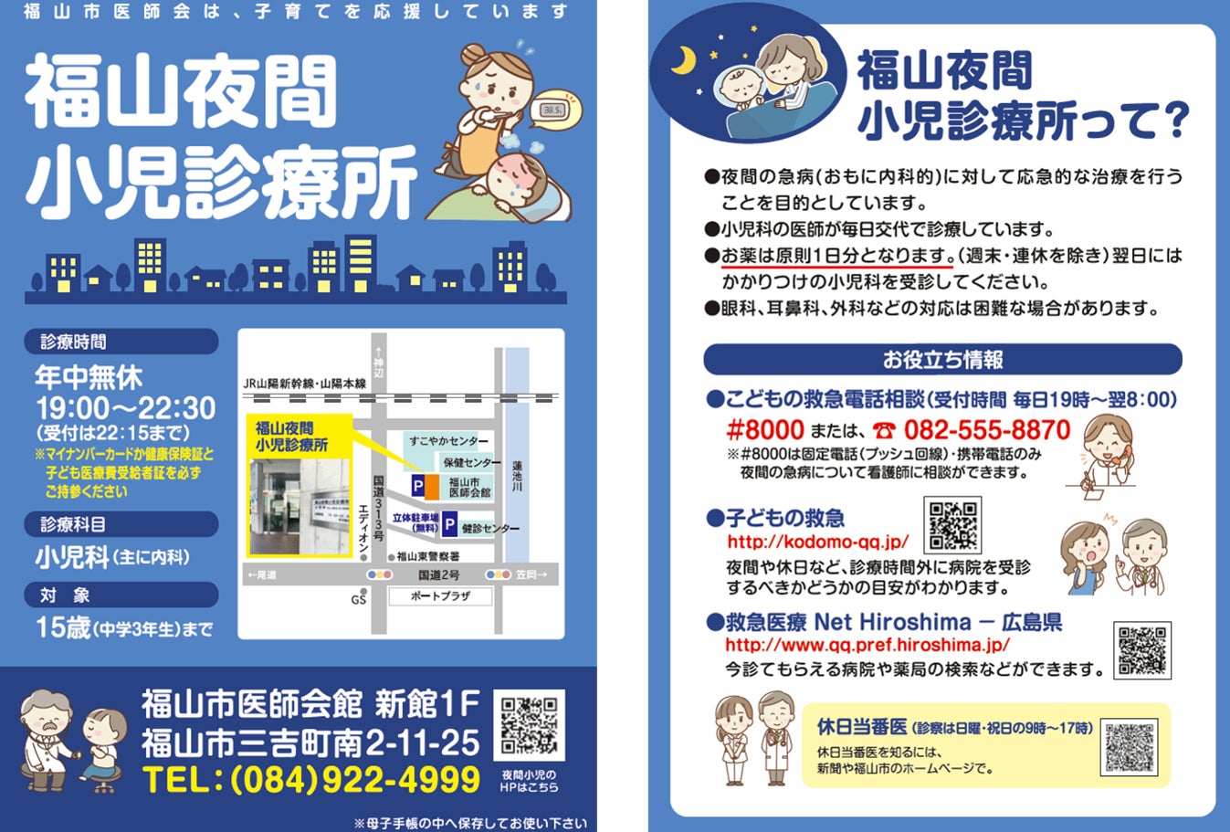 福山夜間小児診療所は、福山市医師会をはじめ、福山薬剤師会の協力のもと、2000年4月より開設され、以降毎日、夜間における子供さんの急病(内科的疾患)の診療を行っています。福山小児科医会の小児科医師が19時から22時30分(受付は22時15分)まで交代で担当し年中無休で診療しています。