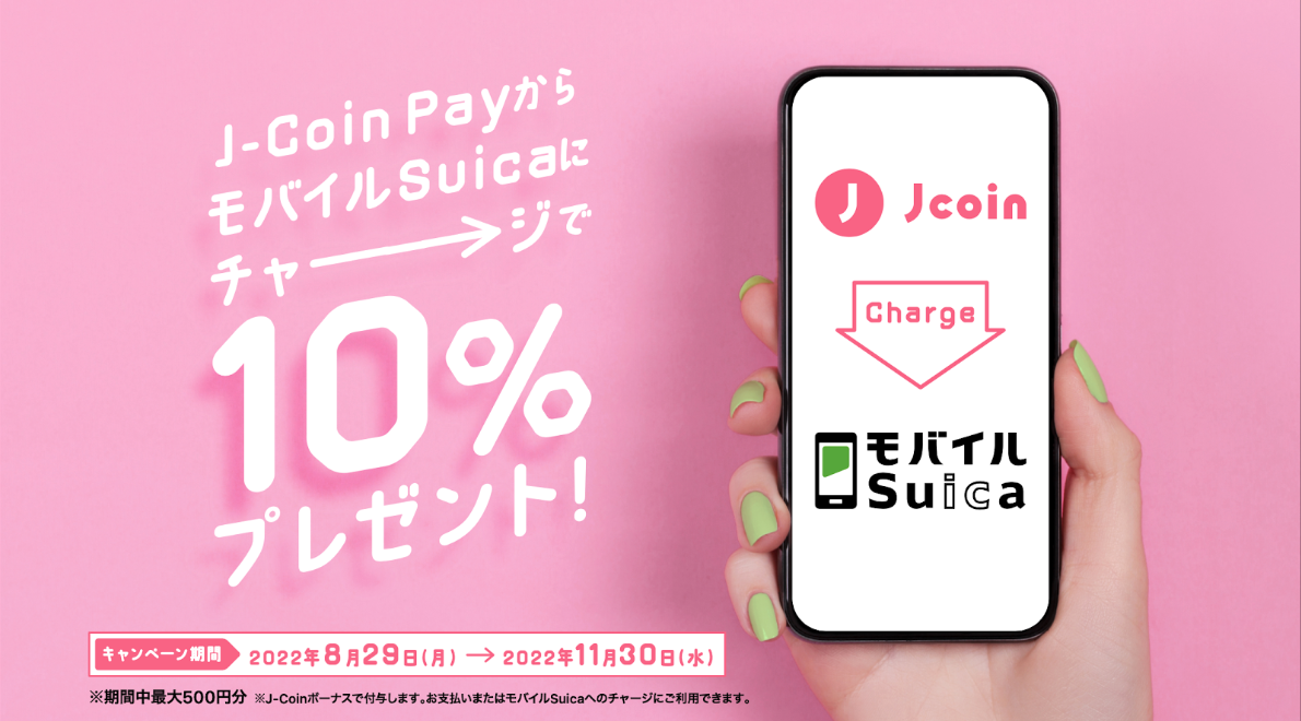 株式会社みずほ銀行が提供し、全国170以上の金融機関が参画するQRコード(※1)を活用した送金・決済アプリ『J-Coin Pay(ジェイコインペイ)」について、期間中にモバイルSuicaにチャージをしていただくと、最大500円まで、チャージ金額に対10%還元キャンペーンを実施する。