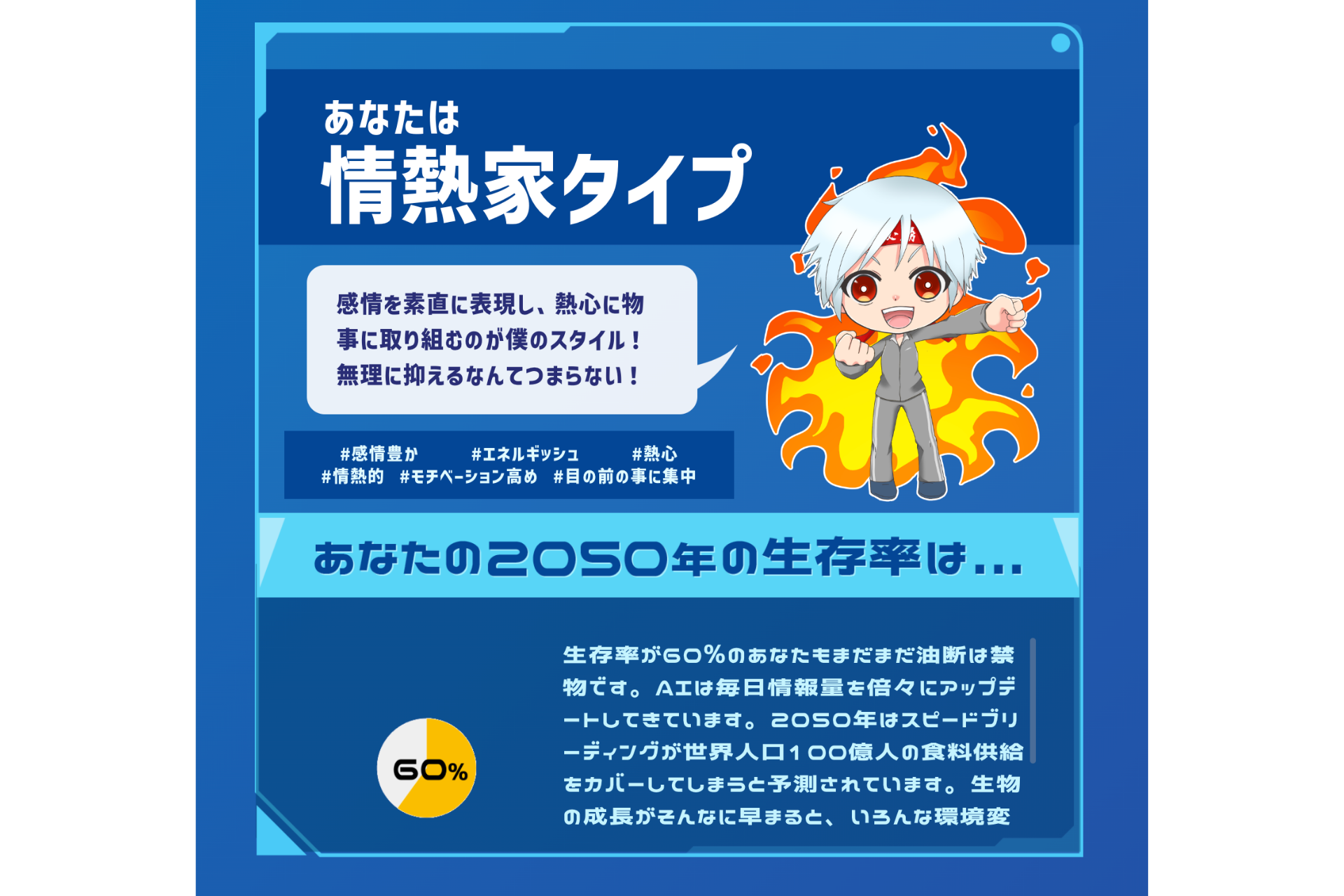 計172問に及ぶ質問に回答すると、「自分のタイプ・2050年の生存率」がわかります。