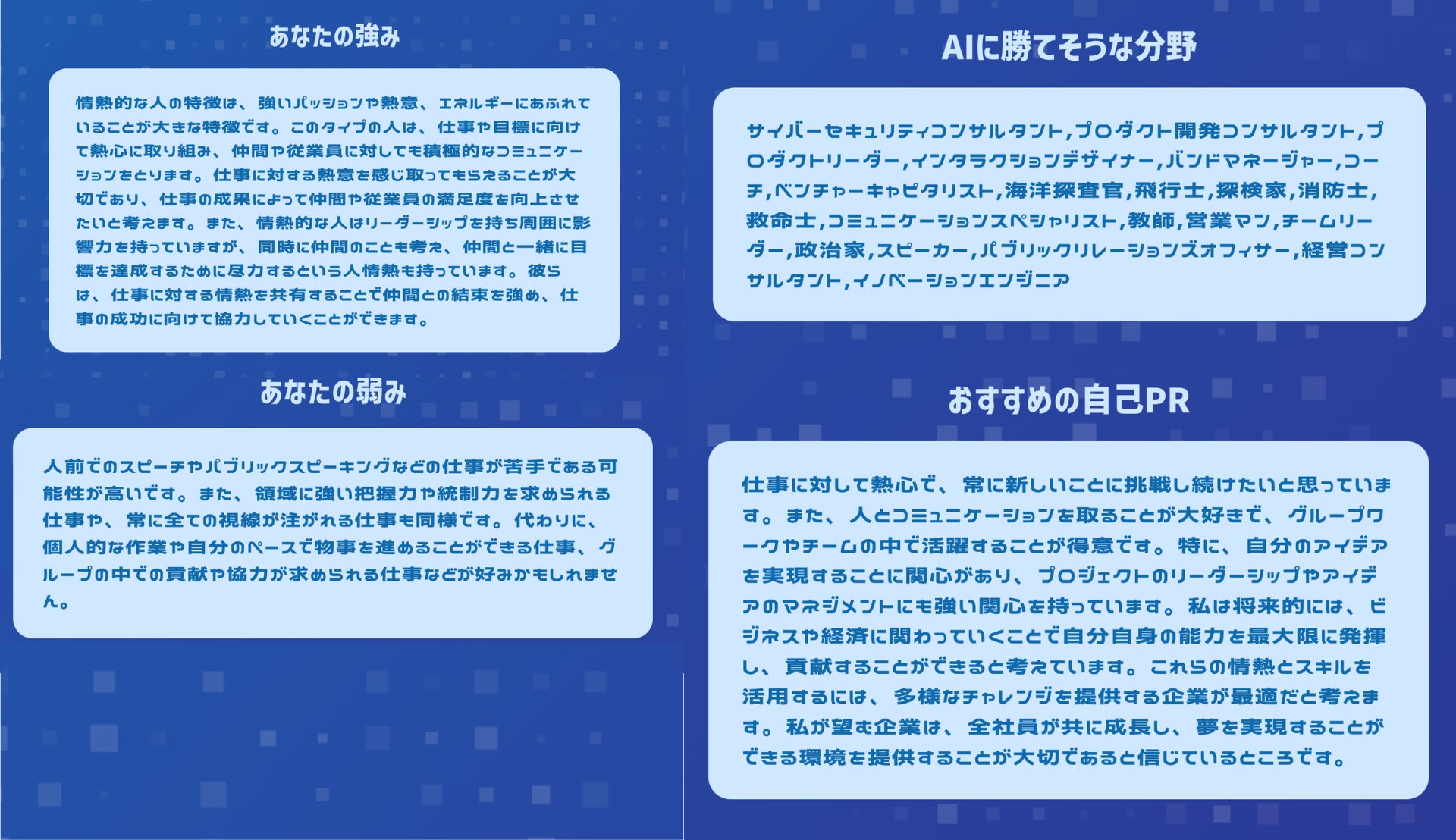 また、分析結果として「あなたの強み」「あなたの弱み」「AIに勝てそうな分野」「おすすめの自己分析」が表示されます。あなた自身の特徴をしっかり把握することができるため、分析結果を参考にすることで、これまでの自己PRよりもあなたの魅力をより企業に伝えられるようになります。