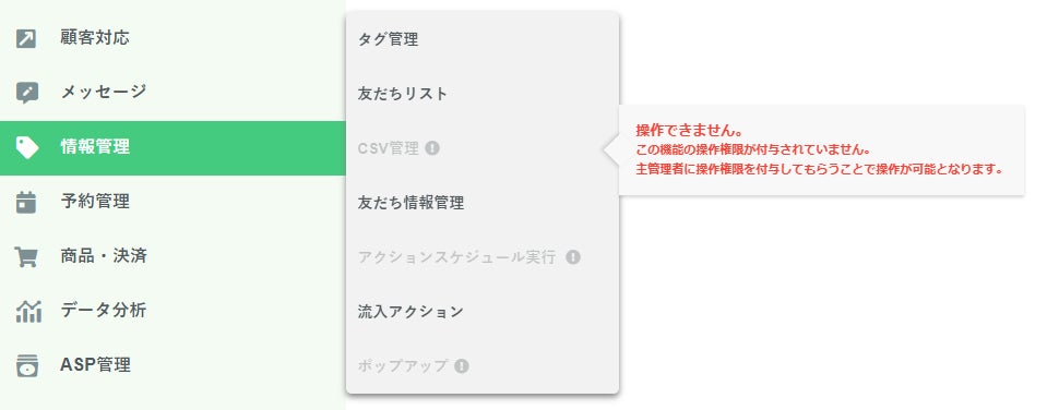 スタッフ用アカウントを利用する際、操作権限がない項目は文字が薄くなり、赤文字で案内文が表示されるようになりました。