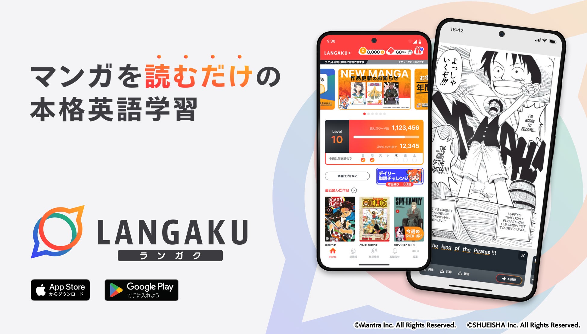 『ONE PIECE』『鬼滅の刃』など集英社公認の80作品以上が英語で読め、物語に没入しながら高密度なインプットが可能です。