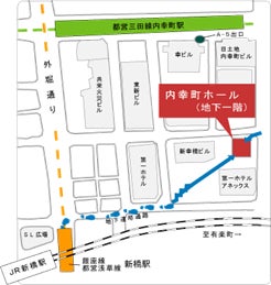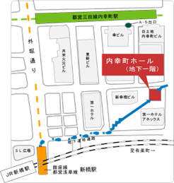 内幸町A5番出口から後方の「内幸町交差点」信号を渡らず右折し、「国会通り」の右側にホール入口。徒歩5分