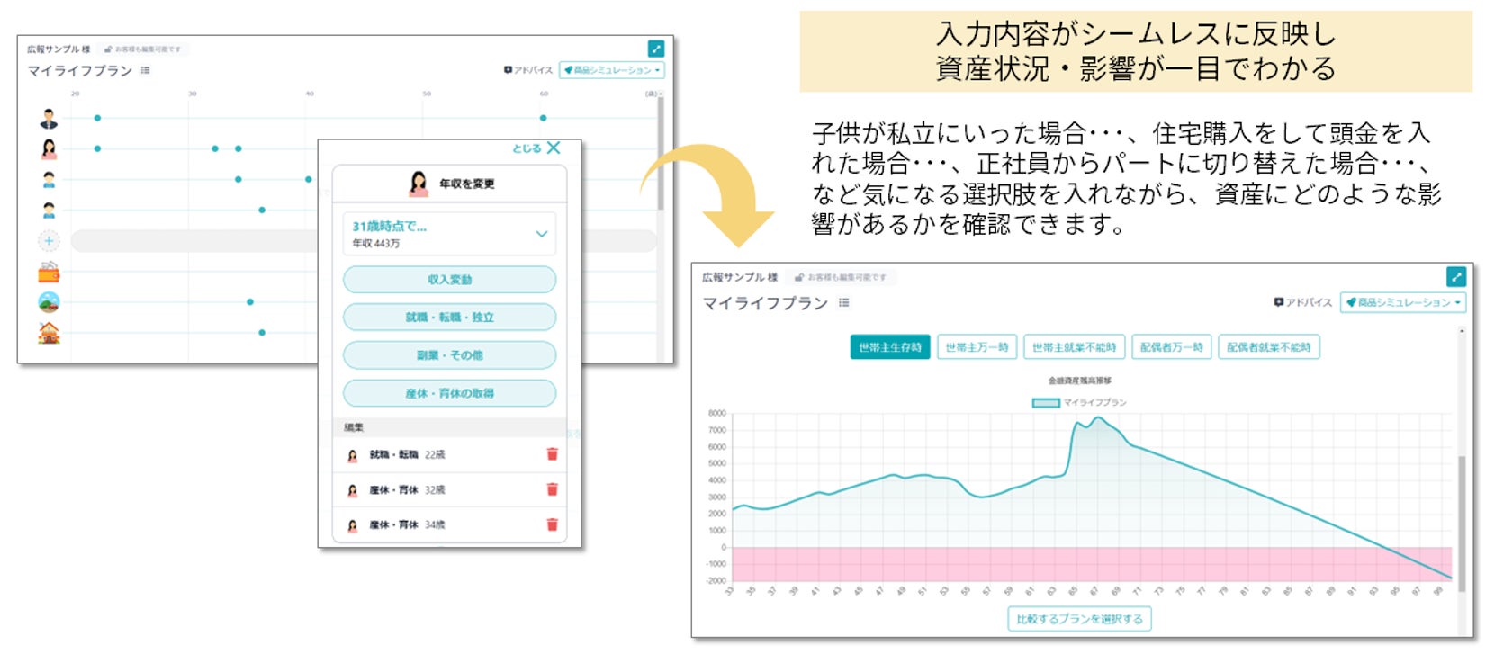 パーソナルな資金的裏付けをもって顧客(ライフプラン)主語の提案を行うことが出来るよう、入力数値をシームレスにグラフに反映するだけでなく、別のライフプランのグラフと重ねて表示ができ、一目で効果が分かります。子供が産まれた場合、家を買った場合など、ライフプランのパターン比較やプロの提案内容の効果検証などに便利です。