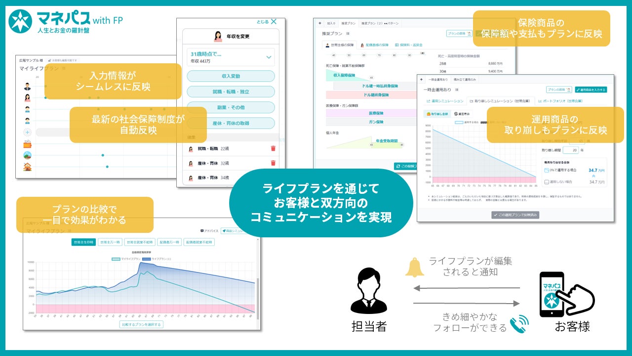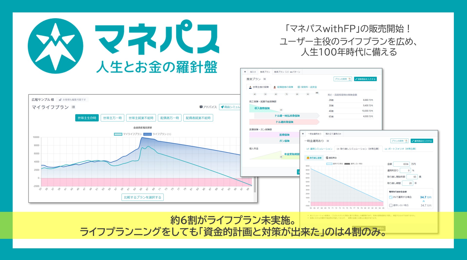 これまでは昨年7月に発表した「マネパスforFP」を自社のコンサルティングツールとして活用していましたが、自助努力による資産形成の重要性が高まっていることを受け、マネパスwithFPとして大幅リニューアルし、本日より金融事業者や不動産事業者等(以下:プロ)への販売も開始いたします。