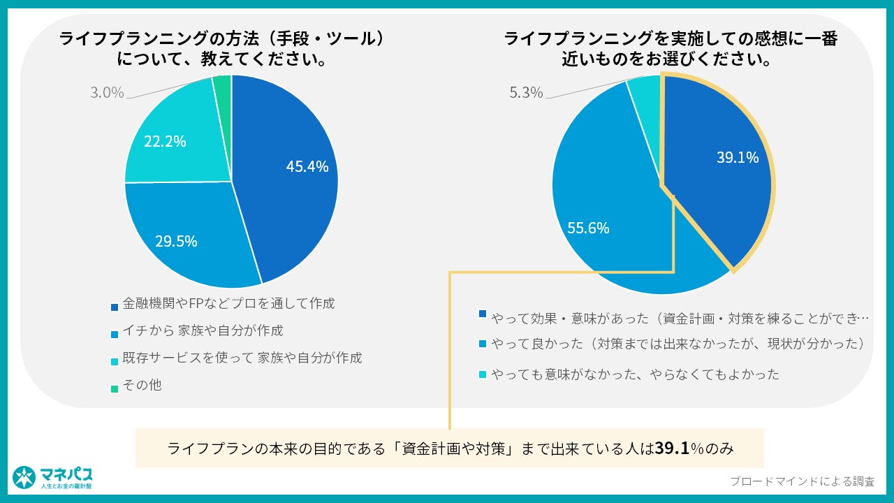 また、やったことがある方にその方法を聞いたところ、最多の45.4%の方が「プロに作成を依頼」していることが分かりましたが、一方で実施した感想を聞いたところ、「資金的計画と対策まで出来たので良かった」という回答は4割に満たない状況でした。プロに依頼をしても本来重要な資金計画や対策まで練ることが出来ていないと感じている方も少なくありませんでした。