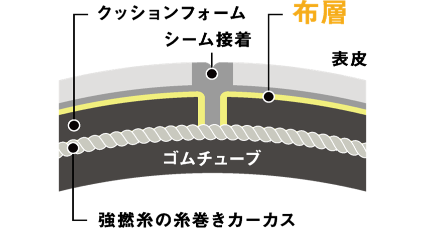 糸巻き用の糸に、強撚糸を使った独自の製造方法を用いています。当社従来品より伸縮性が高く、柔らかいので、選手への負担が少なくなりました。糸巻チューブを覆うパネルには布層を追加し、インパクトがより直接的に伝わる蹴り心地を実現しました。