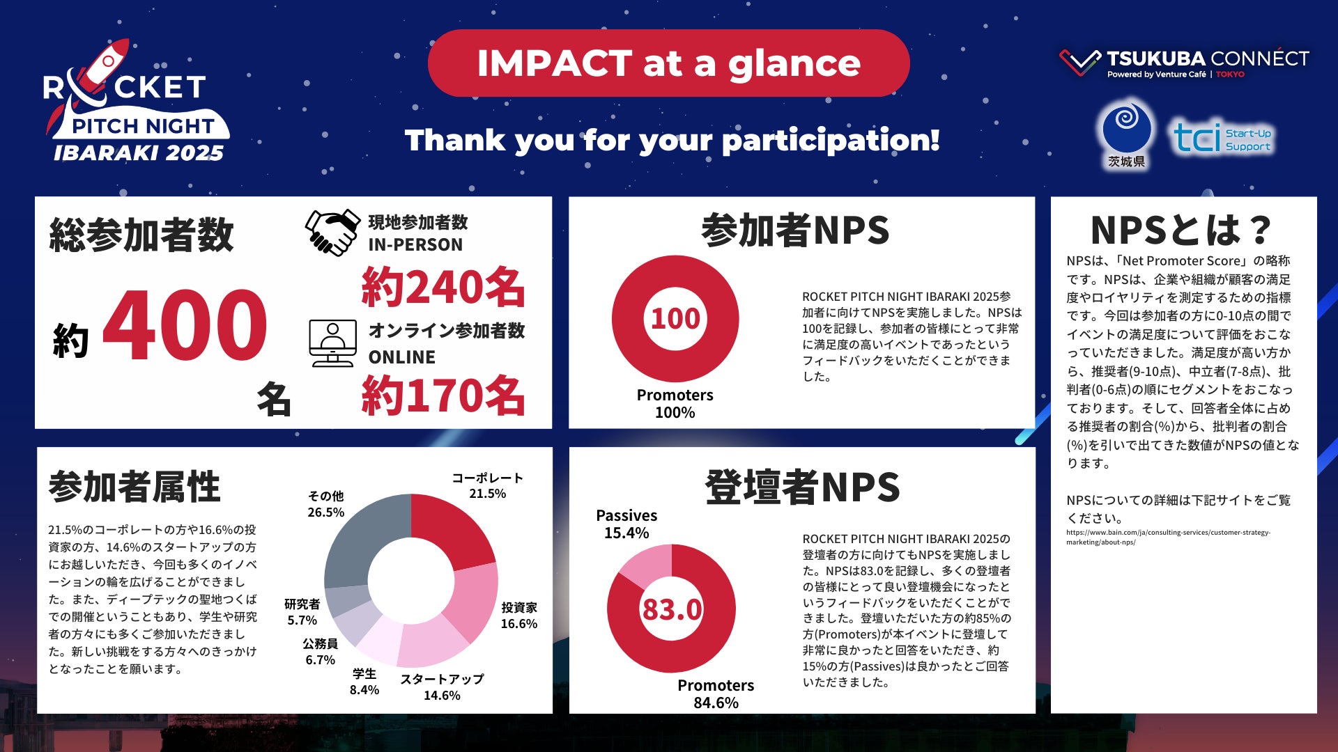 つくば国際会議場にて開催されたROCKET PITCH NIGHT IBARAKI 2025は37組の登壇者、400名以上の参加者を迎え開催。登壇者のNPS®は83と高いスコアを記録!