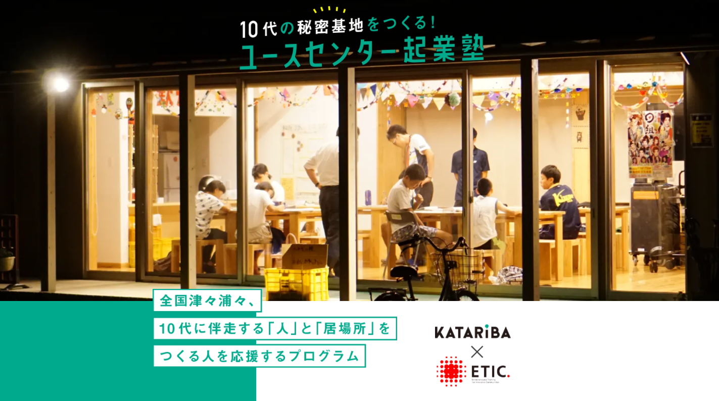 「地方で育ったからこその良さや視点を、もっと伸ばして羽ばたいていけるようにできないだろうか」。そんな想いから、子ども支援に20年取り組んできたカタリバと、社会起業家の支援に20年以上取り組んできたETIC.が連携し、JANPIAによる休眠預⾦等に係る資金提供のもと、日本全国で10代の子どもたちの居場所づくりや学習支援をしている/したい方々を対象に、事業の立ち上げを支援するインキュベーションプロジェクト「ユースセンター起業塾」を立ち上げました。