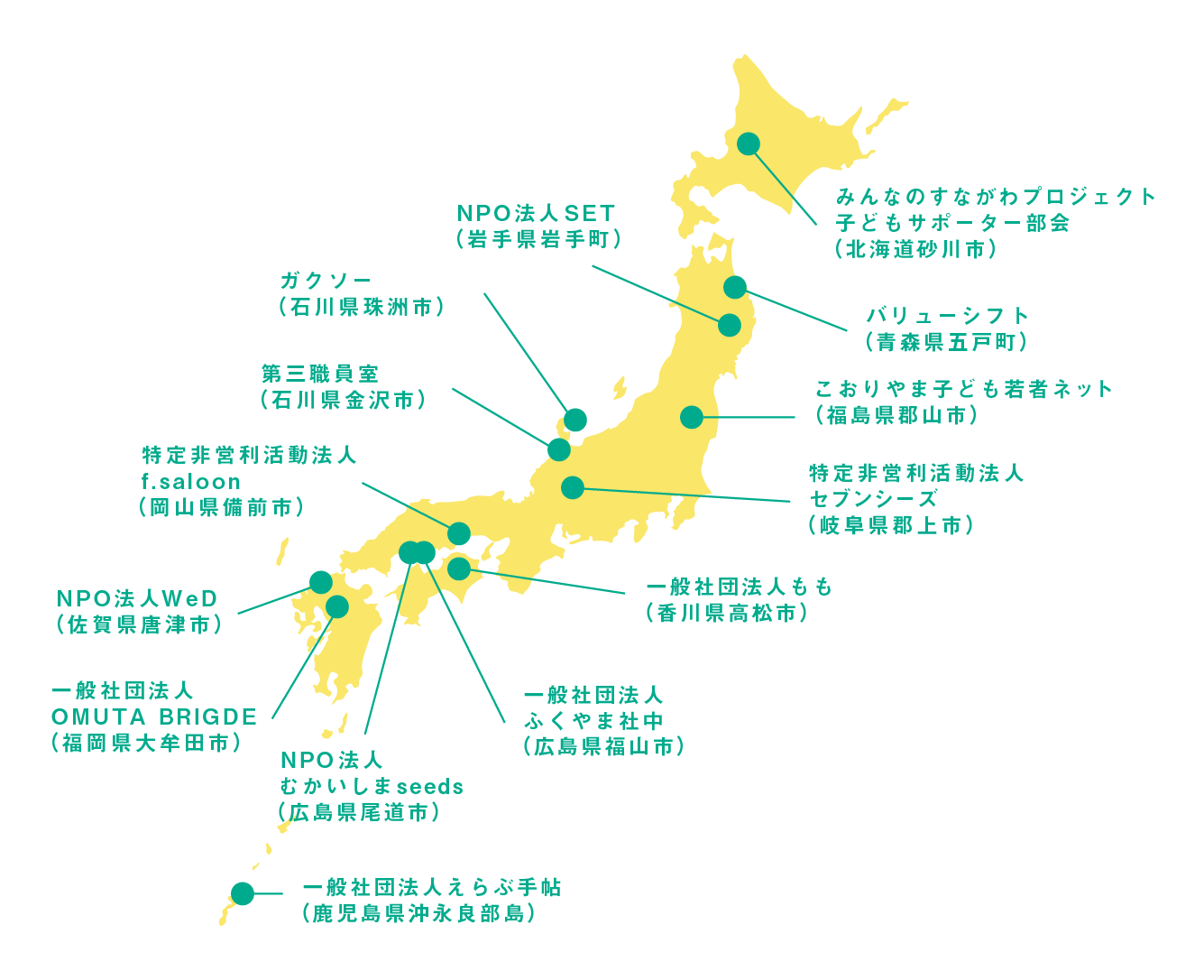 インキュベーションプログラム「ユースセンター起業塾」では、上記14団体の特性にあわせ、「子どもたちの居場所づくり」のための活動を、資金面及び事業面から支援しています。