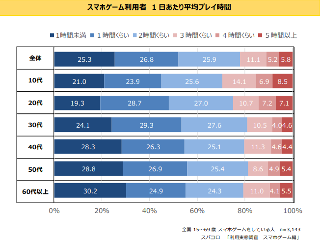 スマホゲーム利用者は日頃実際どれくらいの時間ゲームで遊んでいるのでしょうか?スマホゲーム利用者全体で「1時間未満」25.3%、「1時間くらい」26.8%、「2時間くらい」25.9%、「3時間くらい」11.1%、「4時間くらい」5.2%、「5時間以上」5.8%。全体の約4分の3の人が1日あたり1時間以上スマホゲームを利用していることがわかります。