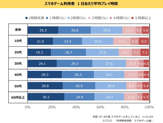 プレイヤーのなかでみると、世代別の利用時間では若い年代で1時間以上プレイしている人がわずかに多いものの、年代ごとに大きな差がないことがうかがえます。