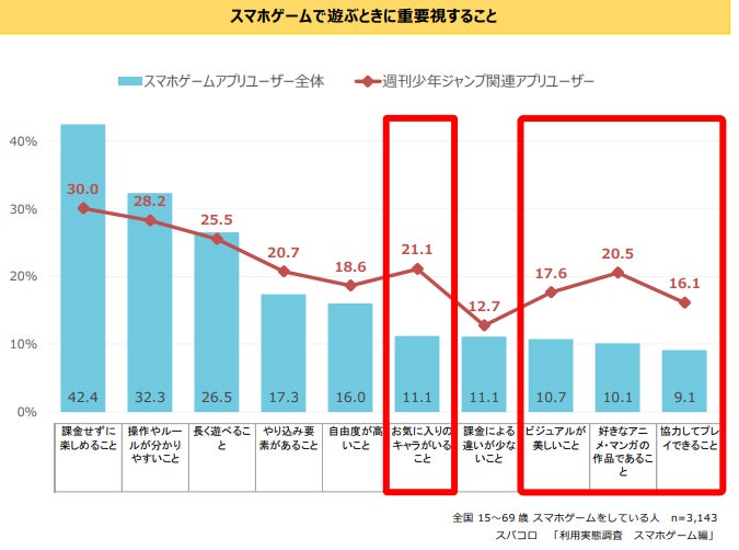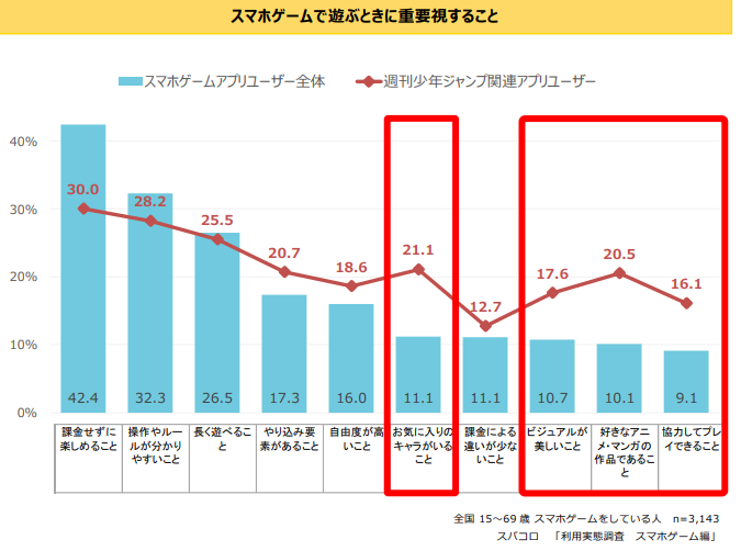 ゲームアプリ利用者全体と重要視する点を比較し、ジャンプ関連アプリユーザーにおいて5ポイント以上高かった点として「お気に入りのキャラがいること」、「ビジュアルが美しいこと」、「好きなアニメ・マンガの作品であること」、「協力してプレイできること」が挙がりました。アニメ・マンガ関連のアプリだけあって“作品“や”キャラクター“、”ビジュアル“への意識の高さがうかがえます。