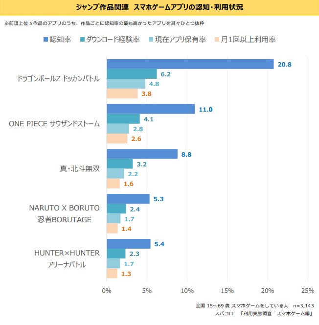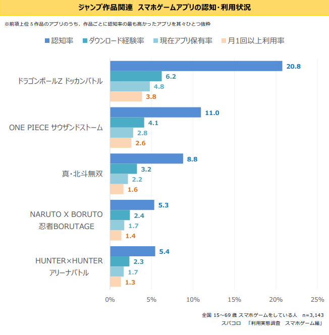 ここでは前述の作品のうち上位5作品関連アプリについて、スマホゲーム利用者における認知・利用状況についてみていきます。認知率上位から「ドラゴンボールZ ドッカンバトル」認知率 20.8%、利用経験率 6.2%、現在アプリ保有率 4.8%、月1回以上アプリ利用率 3.8%。2位は「ONE PIECE サウザンドストーム」認知率 11.0%、利用経験率 4.1%、現在アプリ保有率 2.8%、月1回以上アプリ利用率 2.6%がつづく結果に。アプリをスマホに入れている人は作品自体が国民の半数以上に浸透しているドラゴンボールにおいても5%程度、ONE PIECEにおいても3%程度となっていることがわかります。