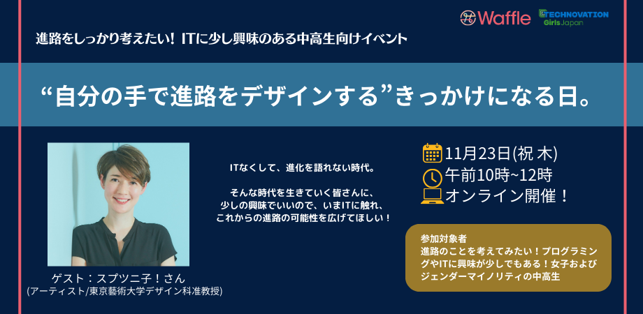 当日は、スプツニ子!さん(アーティスト / 東京藝術大学デザイン科准教授)をゲストにお招きし、IT・テクノロジーの面白さや、今後の進路やキャリアの中での活かし方などについてお話しいただきます。