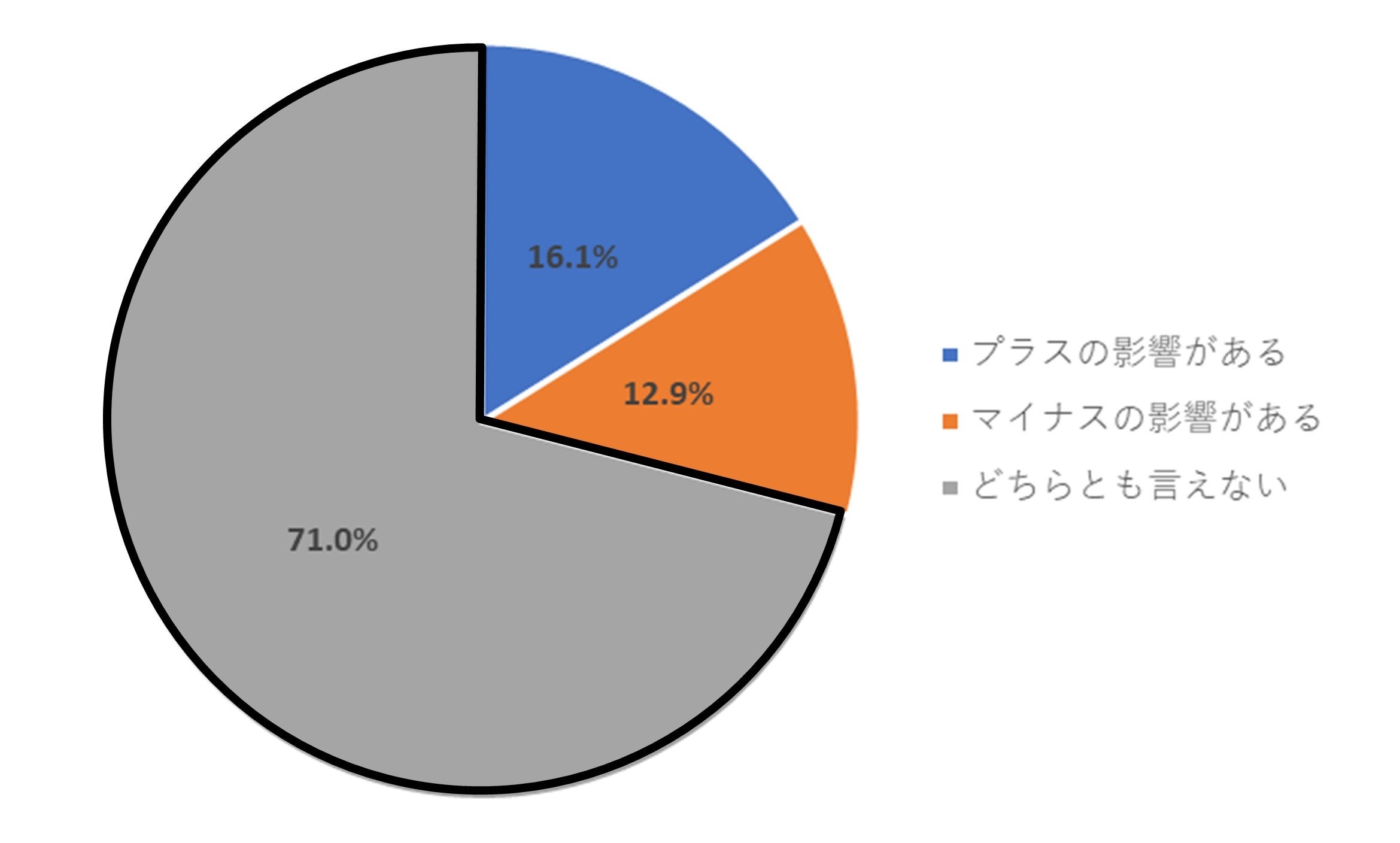 新型コロナウィルスの5類移行における業績への影響について、「どちらともいえない」が最多の71.0%であった。「プラスの影響がある」と回答したのは16.1%、残りの12.9%が「マイナスの影響がある」という結果になった。
