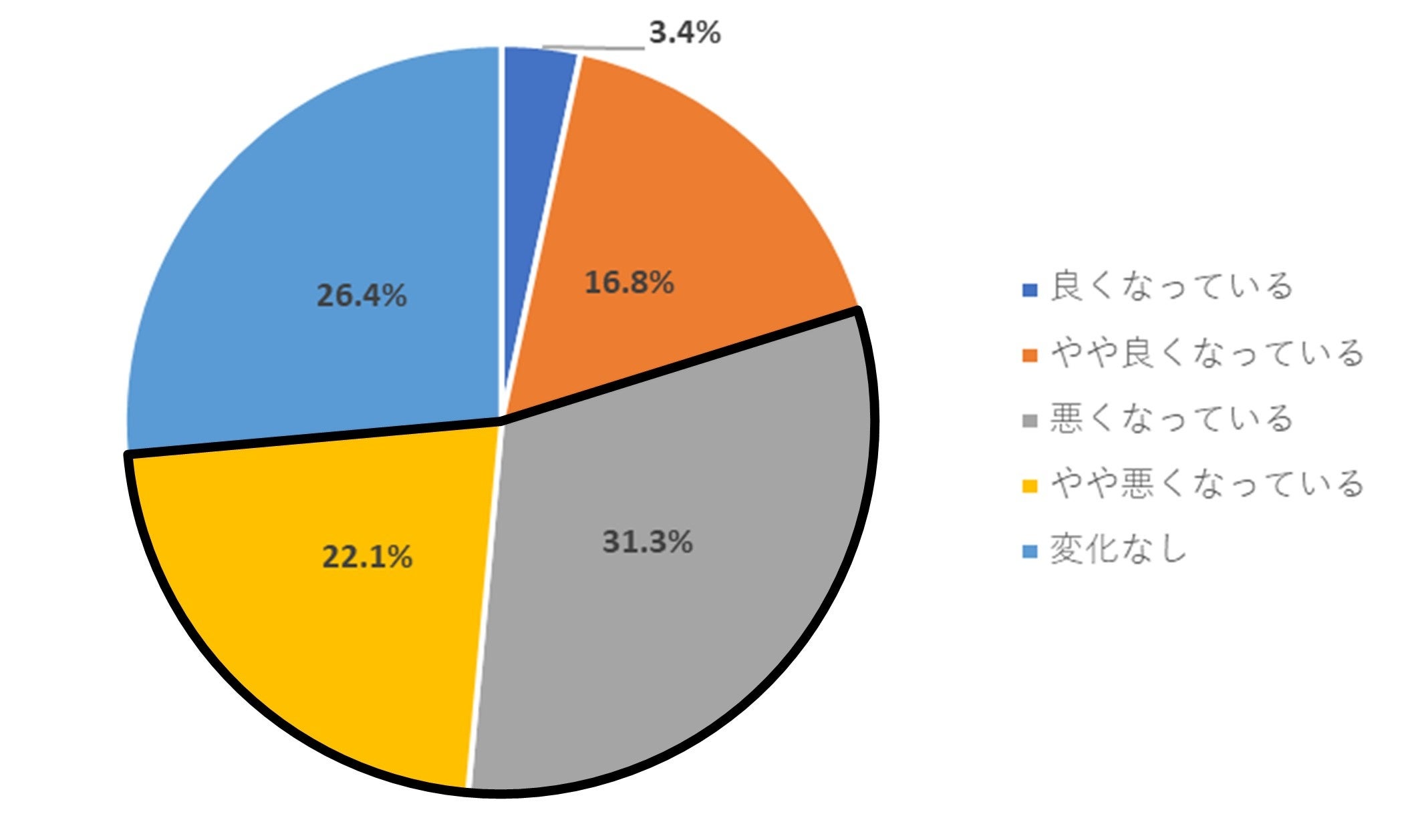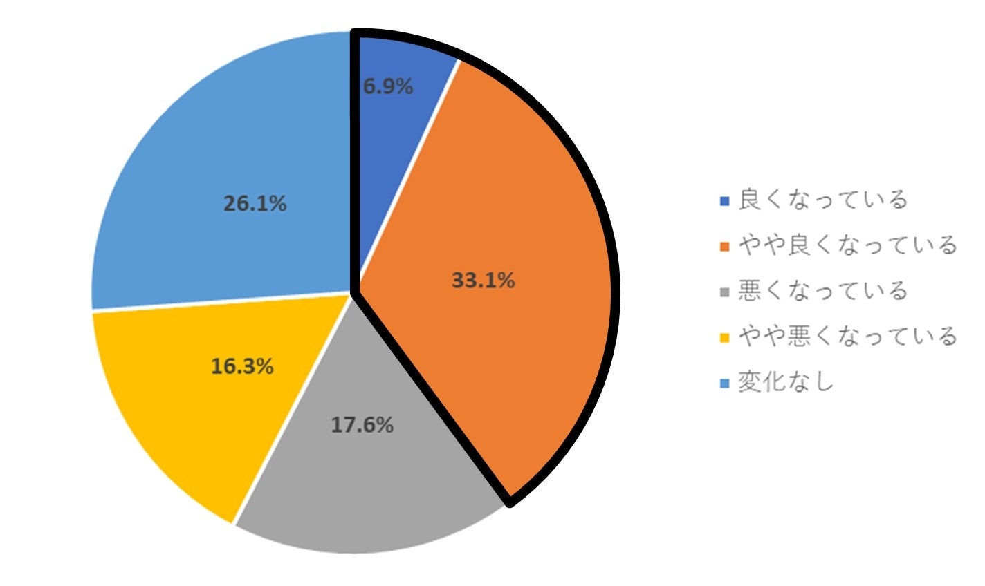 身の回りの景気の変化について聞いたところ、「良くなっている」が6.9%、「やや良くなっている」が33.1%で、景気の変化にポジティブな印象を持つ方が全体の40.0%という結果になり、昨年下期と比較しても19.8ポイントの上昇となった。その他、「悪くなっている」は17.6%、「やや悪くなっている」が16.3%、「変化なし」は26.1%であった。