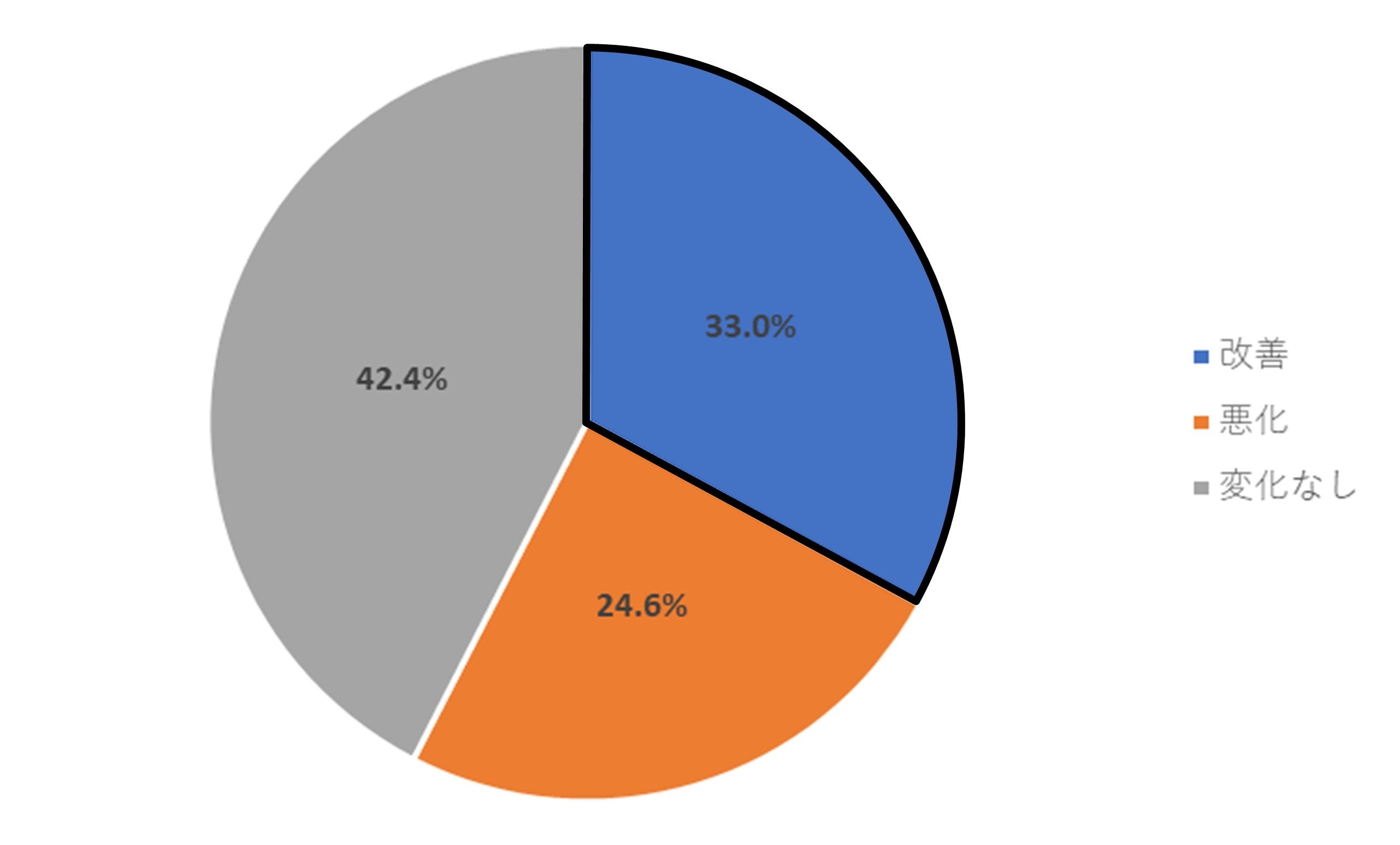 2022年下期と営業利益を比較した際、「改善」したと回答した企業は全体の33.0%であった。また、「悪化」したという回答は24.6%、「変化なし」は最多の42.4%であった。