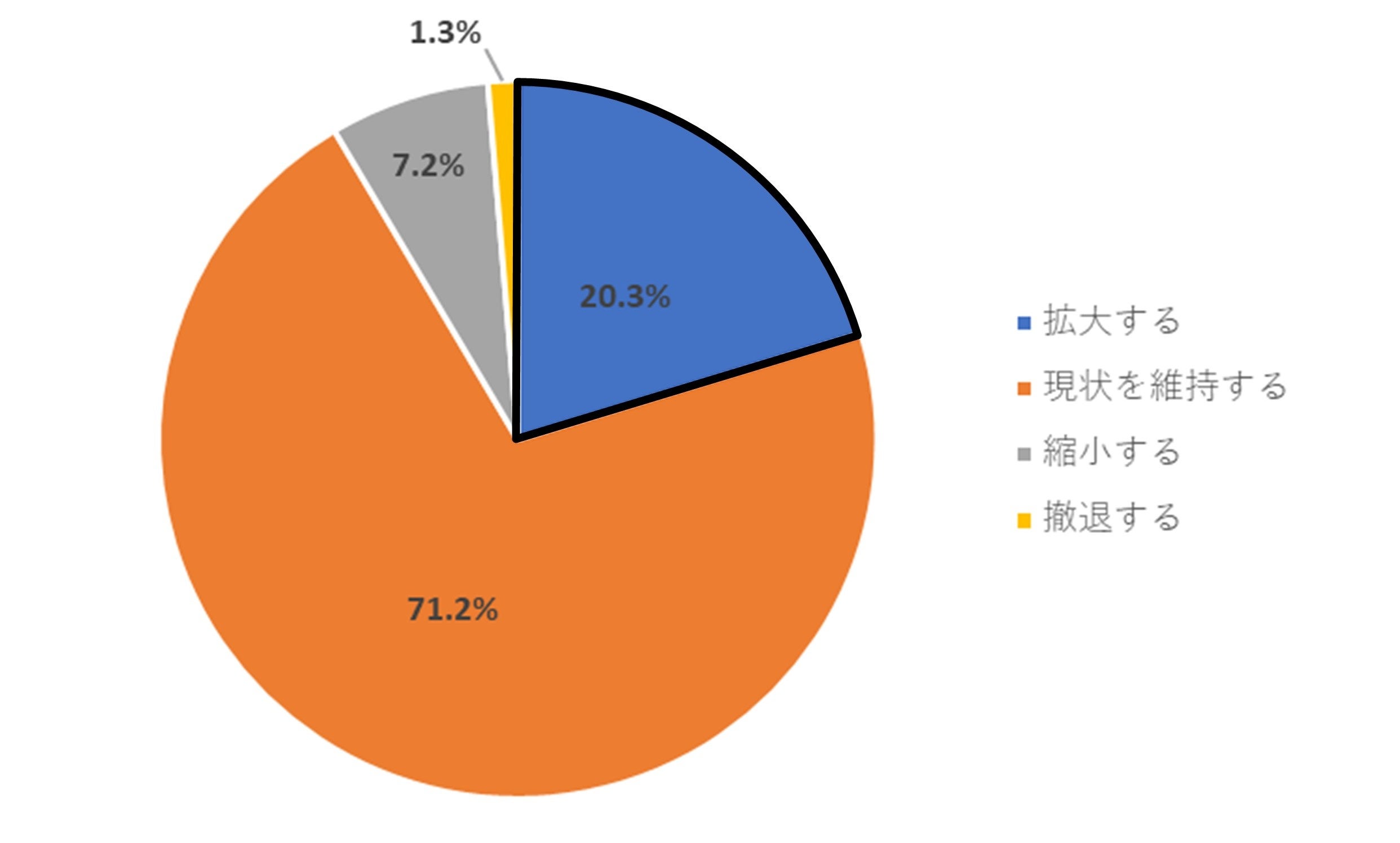 今後の事業展開の方向性については、20.3%が「拡大する」と回答し、「現状を維持する」が最多の71.2%という結果になった。その他、「縮小する」が7.2%、「撤退する」が1.3%であった。