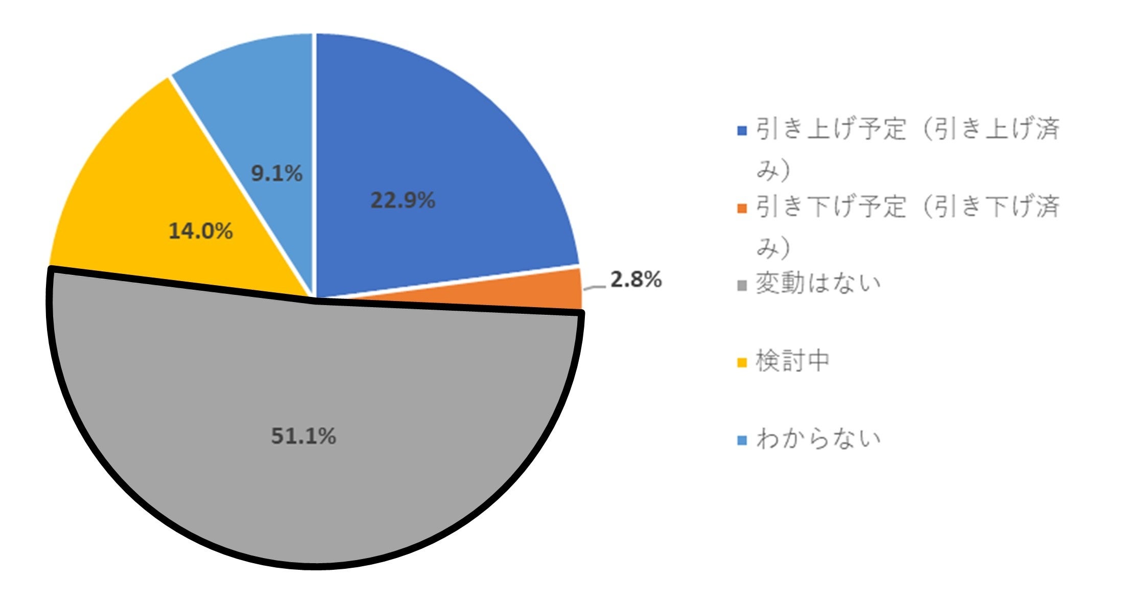 賃金の引き上げ、もしくは引き下げの実施予定について聞いたところ、「引上げ予定(引上げ済み)」は22.9%、「引き下げ予定(引き下げ済み)」は2.8%、「変動はない」が過半数の51.1%という結果に。その他、「検討中」は14.0%、「わからない」が9.1%であった。