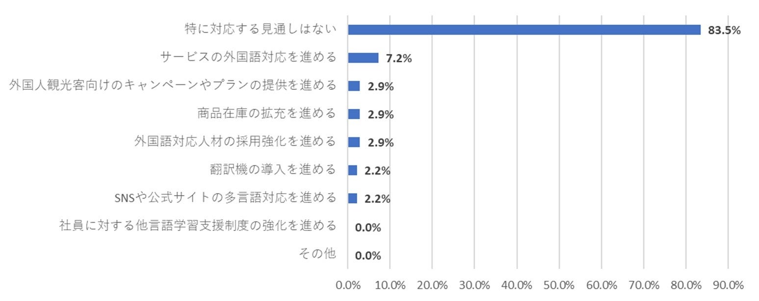 インバウンド需要増加の恩恵を特に見込める業種(観光業・飲食業・宿泊業・サービス業)に絞った場合の対応可否についても、全体の83.5%が「特に対応する見通しはない」という結果になった。