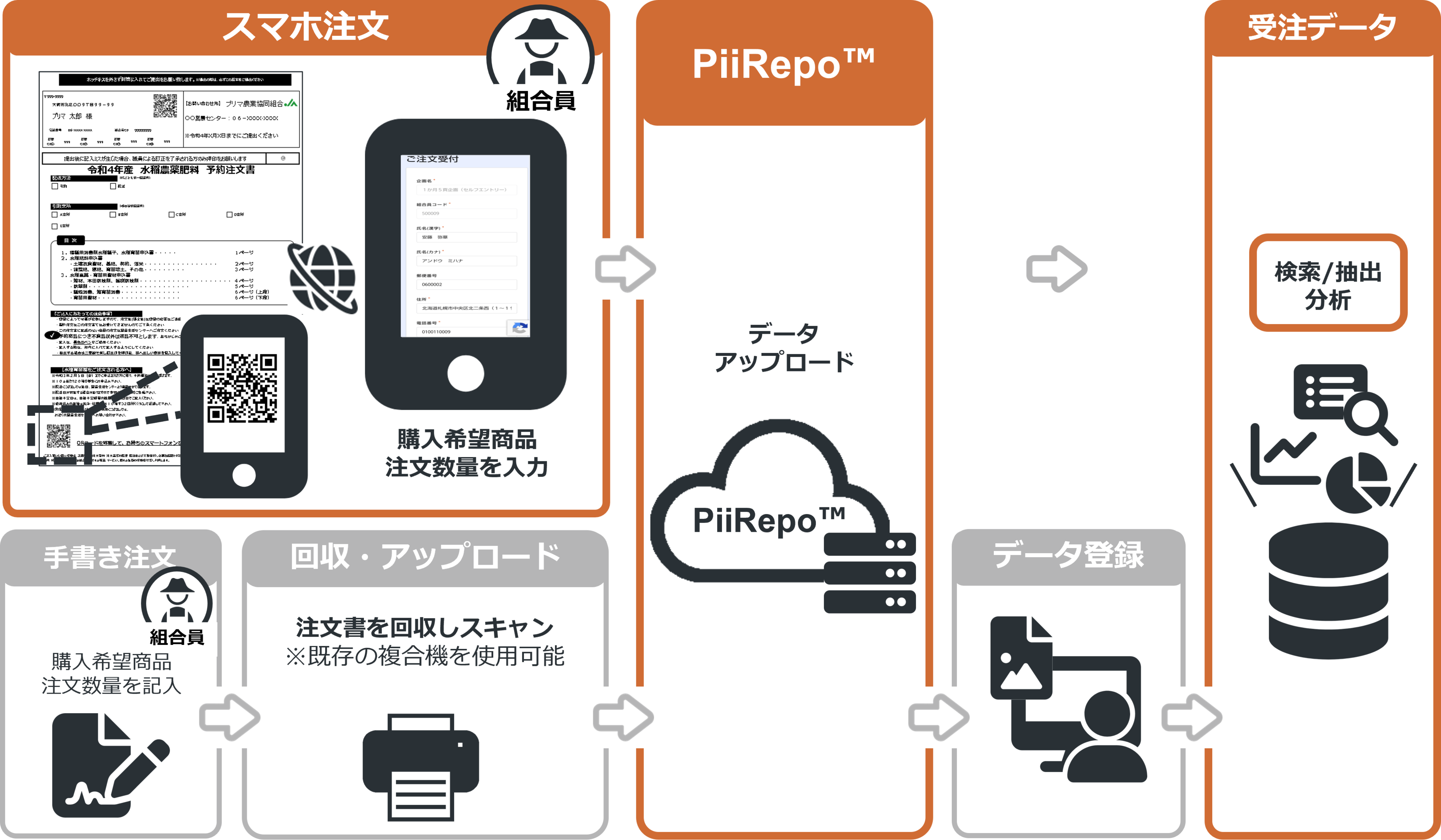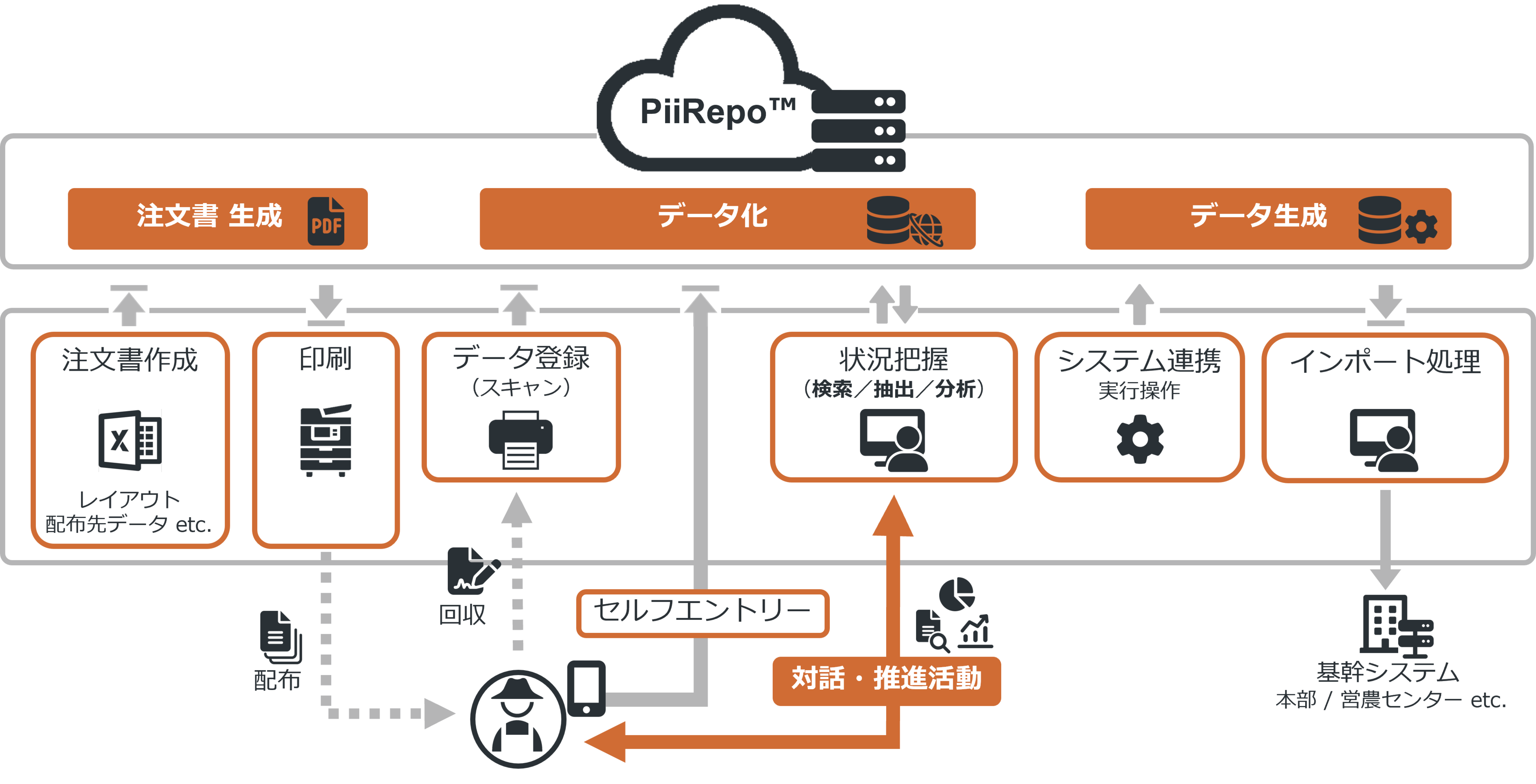 「PiiRepo™」では、資材・肥料等の注文書など、紙書類の入力・確認業務を行うことなく、各書類のデータ化や分析が迅速にできるようになります。紙書類のスキャンデータや、スマートフォン等からの注文データをアップロードすることにより、クラウド上でデータの生成および保管が行われます。また、クラウドで管理されたデータは、検索・修正、分析をすることが可能です。これにより、組合員の状況や経過をタイムリーに把握し、円滑で的確な推進活動につなげることができます。