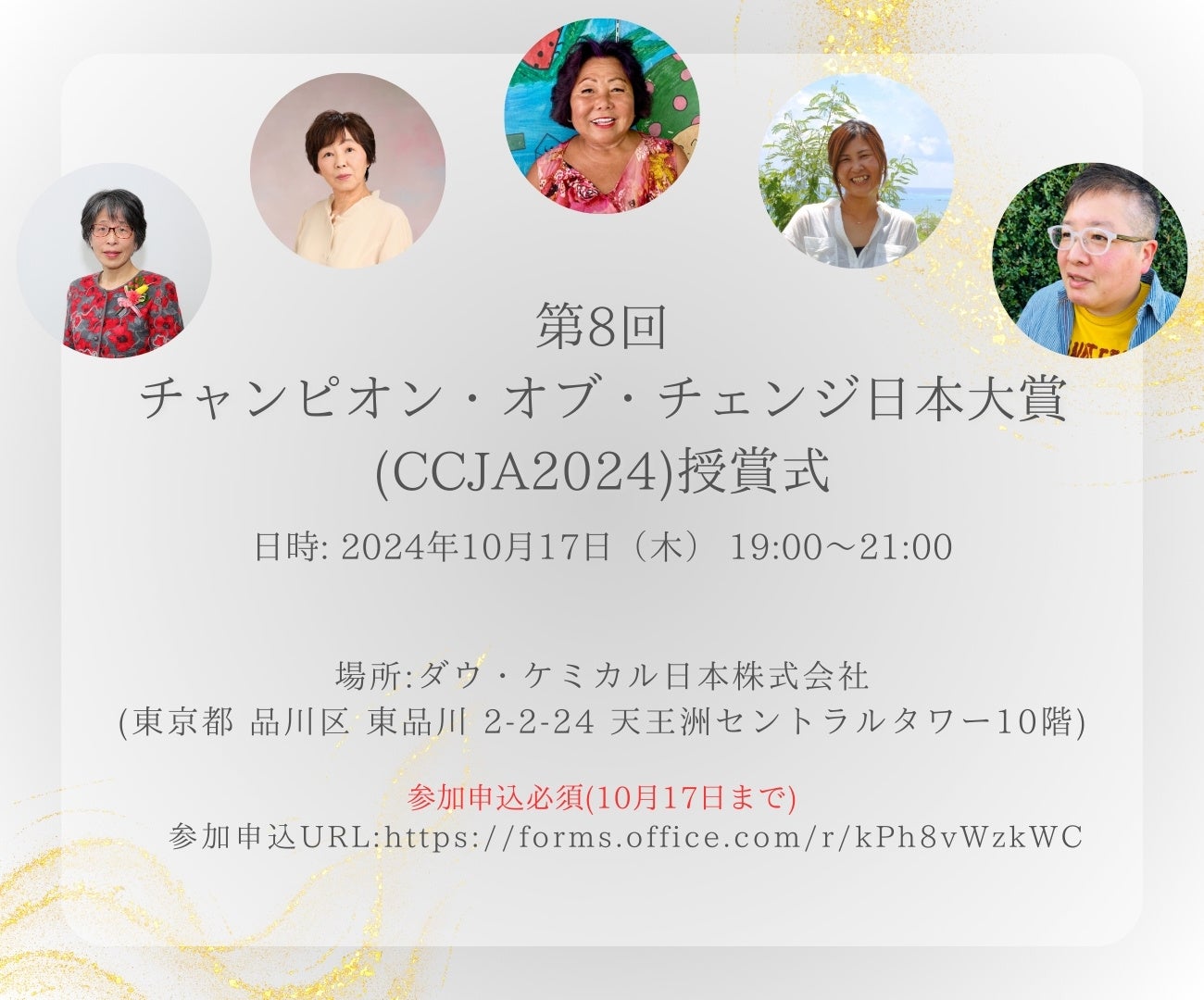 Champion of Change Japan Award (CCJA), 2017年設立。様々な社会問題や地域社会の課題に対して自ら行動し、地道に活動を続け、課題解決に貢献している女性たちに贈られる賞です。毎年200通の他薦による応募を受け、大賞受賞者へは100万円の賞金が贈呈されます。