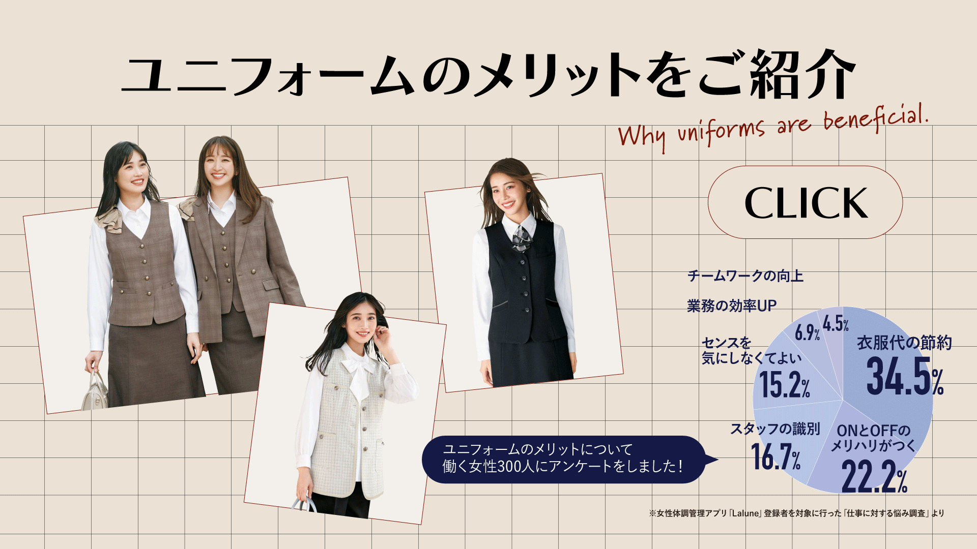 女性向け体調管理アプリ「Lalune(ラルーン)」で行われたアンケート調査(※)によると、多くの働く女性がユニフォームに対してポジティブな印象を持っていることが分かりました。