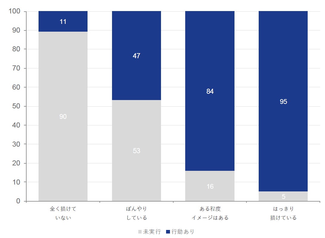 将来像が全く描けていない層では約9割が未行動にとどまり、はっきり描けている層では95%がすでに行動しています。