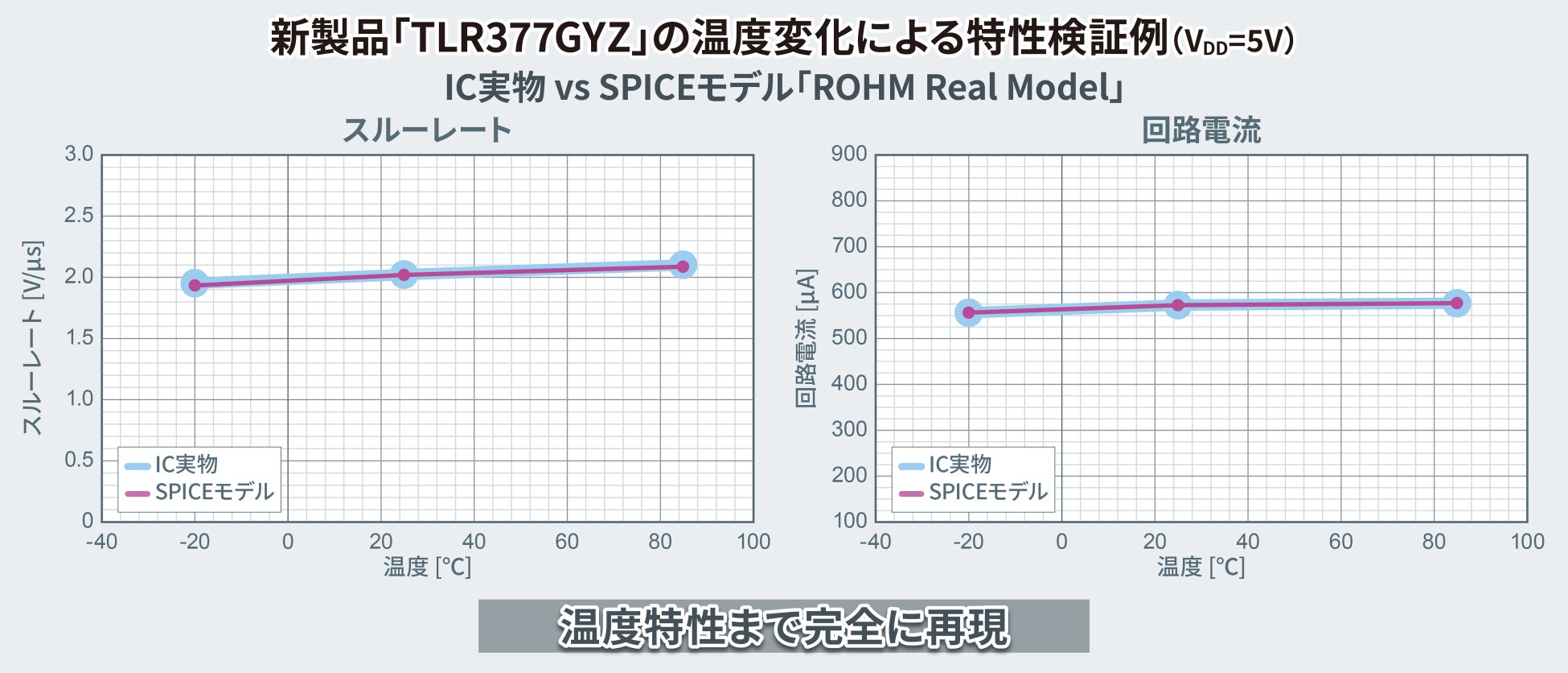 新製品の検証用シミュレーションモデルでは、ローム独自のモデルベース技術を駆使して、IC実物の電気的特性と温度特性を忠実に再現することで、IC実物とシミュレーション値の完全一致に成功した高精度SPICEモデル「ROHM Real Model」を完備。確実な検証により、実機試作後の手戻りを防止できるなど、効率的なアプリケーション開発に貢献します。