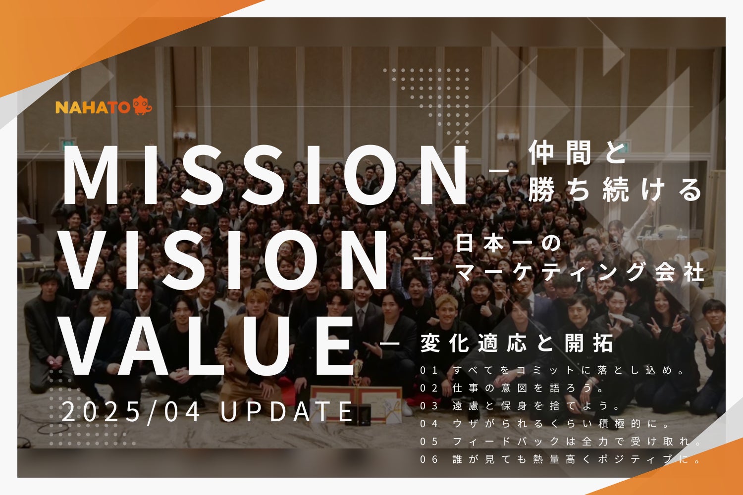 そこで、MISSIONを「仲間と勝ち続ける」、VISIONを「日本一のマーケティング会社」、VALUEを「変化適応と開拓」といった、ナハトが大切にする本質の想いを捉えつつ難しいメッセージ性を削ぎ落としたシンプルな言葉へとアップデートすることに至りました。
