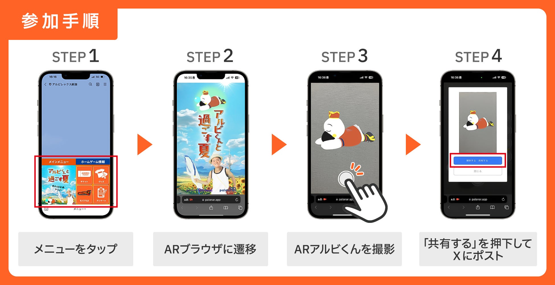 LINE公式アカウント「アルビレックス新潟(https://liff.line.me/1657932593-DVLGN62A?tcode=3FcSR0000009387)」からARコンテンツを起動させ、AR化したクラブマスコットのアルビくんと一緒に撮った写真をSNSに投稿するキャンペーンです。