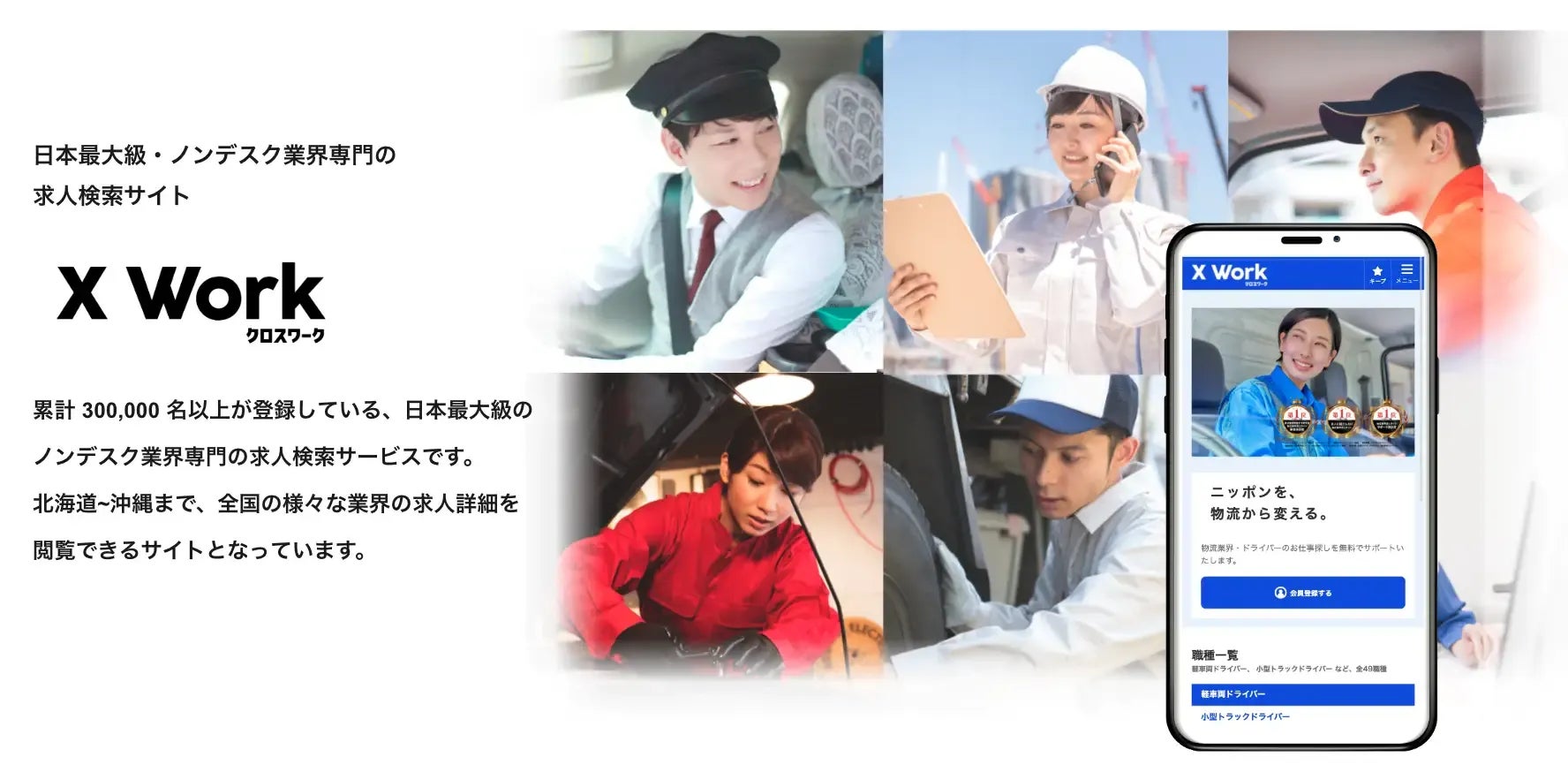 物流業・建設業・製造業などのノンデスクワーカーの採用に強みを持ち、登録者数は月間1万人以上と日本最大級の求人サイトです。登録者の70%以上が20代~30代の若手求職者や、40代中堅層で占めており、業界ならではの免許や資格所有者が90%以上と、求める人材を見つけやすいのも「クロスワーク(X Work)」の特徴です。過去5,000社以上の取引実績があり、紹介可能職種は、ドライバー、整備士、施工管理・建築士、運行管理、倉庫管理、警備員、技術職と各業界のノンデスクワーカーに特化しています。