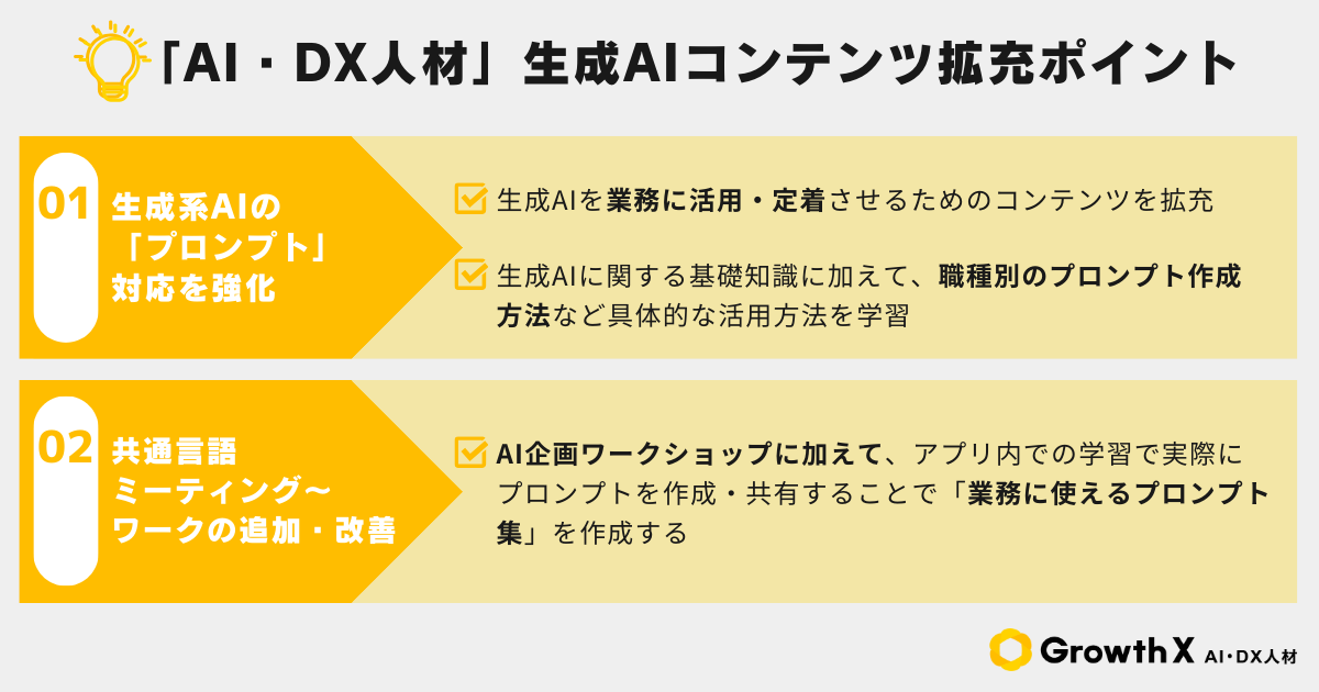 昨今のChatGPTをはじめとする生成AIの隆盛により、企業での生成AI活用の学習ニーズが急激に増加しています。その流れを受け、「グロースX AI・DX人材」でも、生成AIを業務に活用・定着させるためのコンテンツを拡充し、2024年2月からアップデート版を提供いたします。